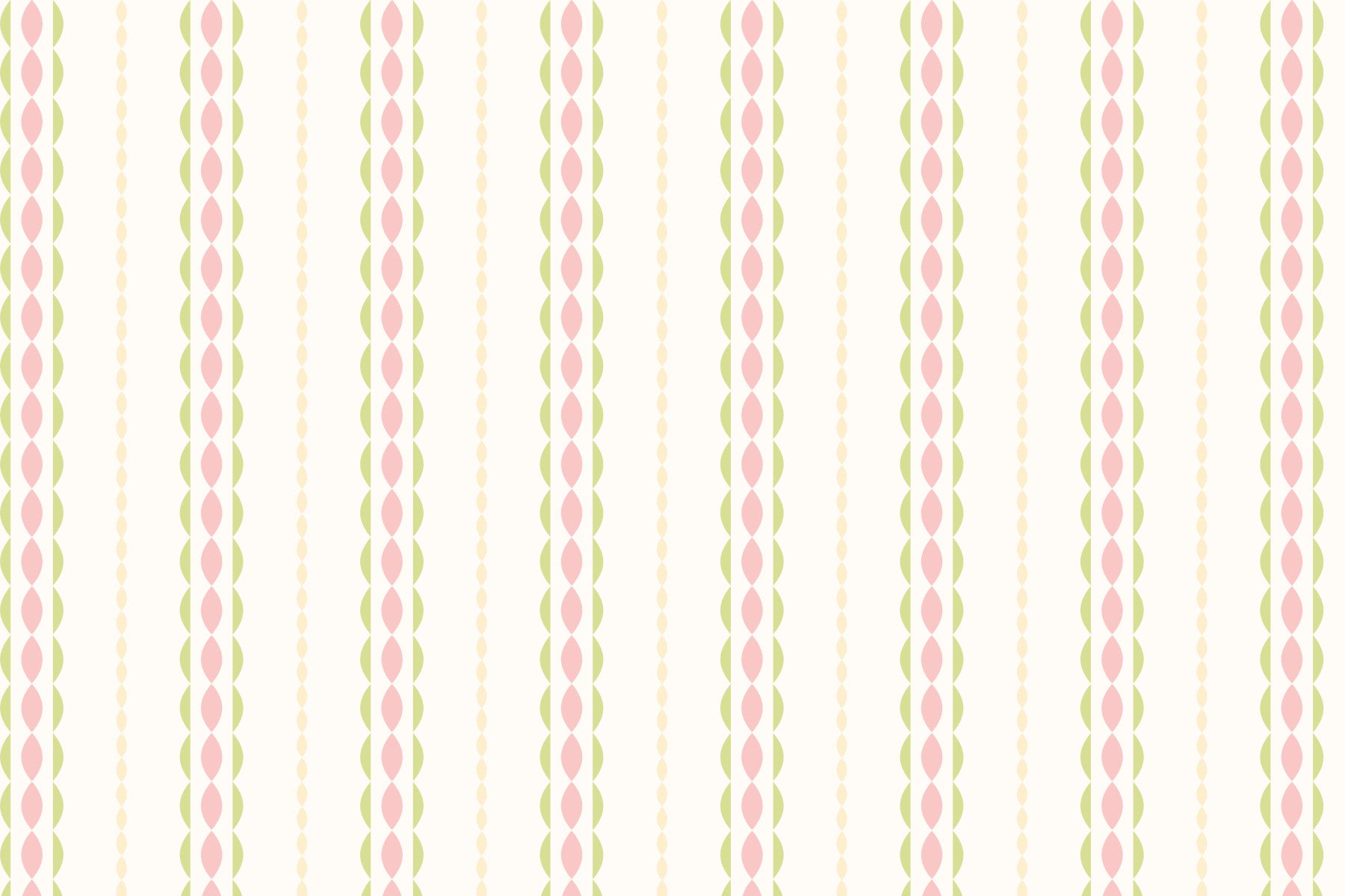 Give your room a fresh, light lift with this simple design. Vertical bands feature pink and green petal shapes, separated by strings of dots, all on a soft white backdrop. This wallpaper for walls offers a clean, playful aesthetic, ideal for a child's bedroom, playroom, or bathroom. The pastel shades bring a gentle calm, making it easy to coordinate with other decorations. Transform your space with this soft, inviting style.