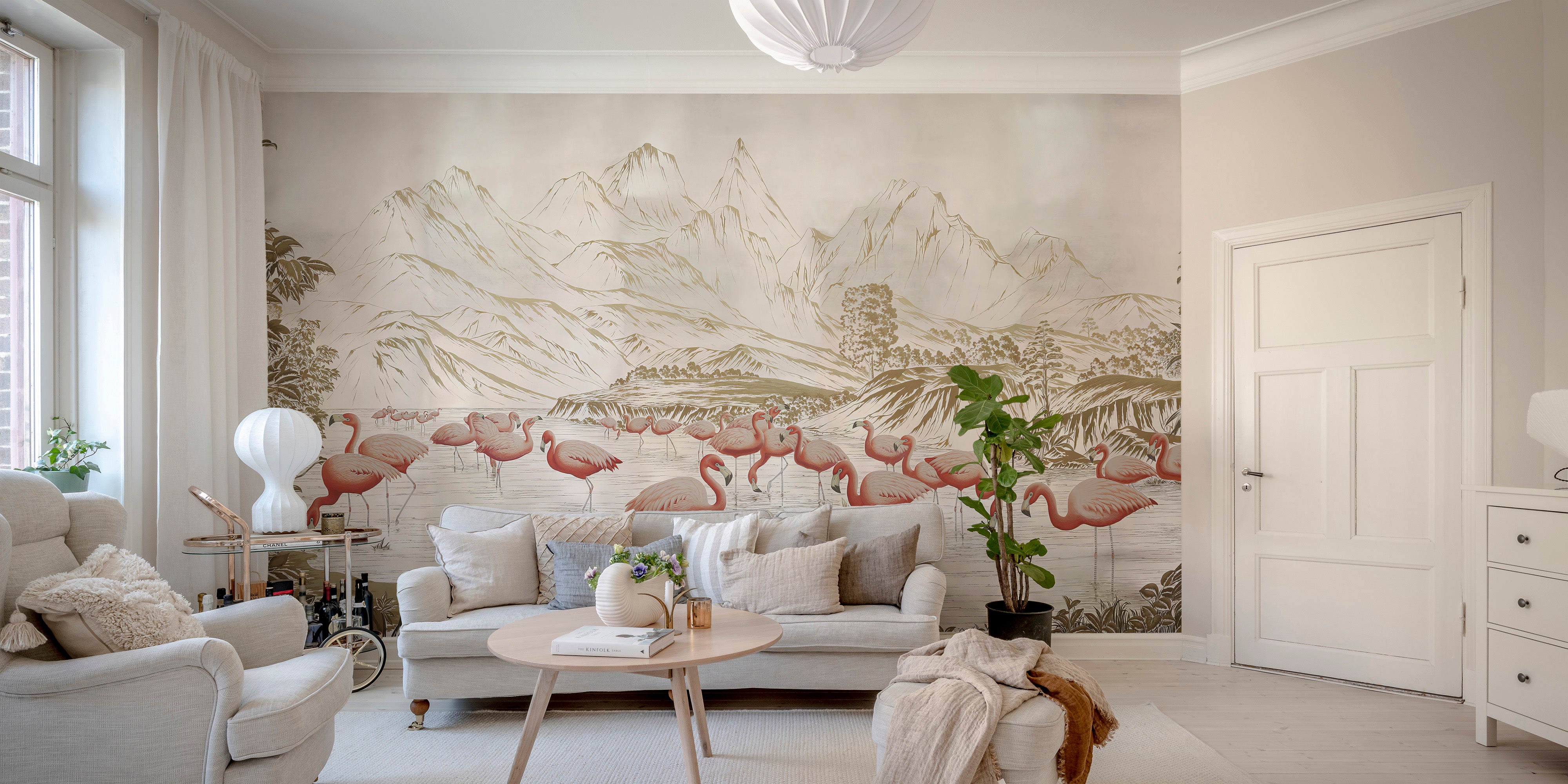 Introduce some relaxed vibes into your space with our flamingo pastel pink wallpaper. A stylish wall mural with a refreshing flamingo pattern on a pastel-colored backdrop that will be amazing in your interiors. The light colors flow well with modern minimalist decor and also shabby chic cabinetry.