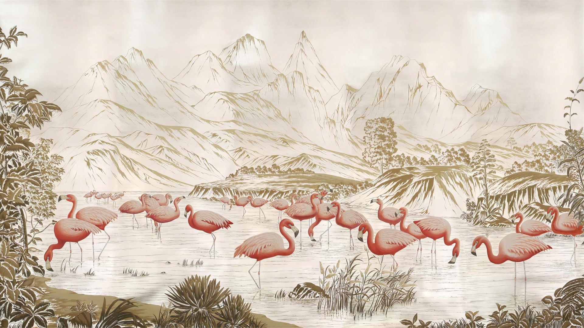 Luxury flamingo wallpaper with soft mountain scenery