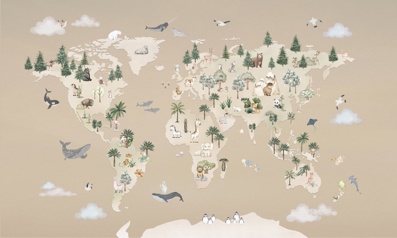 Invite wonder with this whimsical world animal wallpaper! Explore a beautifully illustrated map, showcasing animals in their native regions. This wallpaper for walls encourages learning and discovery, ideal for playrooms, children's bedrooms, or a classroom. The gentle pastel tones create a calm atmosphere, while the detailed watercolor renderings offer visual interest. It complements many interiors, adding a playful and educational touch to the space. Inspire your little ones with this charming design.