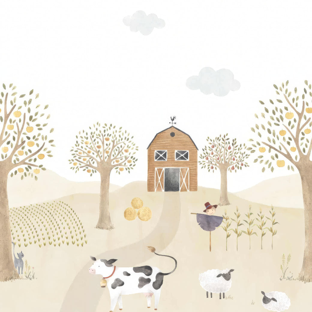 Adorn your walls with the charming pastoral pals barnyard mural, a delightful addition to any room seeking a touch of the countryside. With its warm beige wallpaper tones, this mural is a storybook escape to a gentle farm scene, where playful animals frolic under fruit-laden trees beside a classic wooden barn. It’s a seamless blend of rustic charm and whimsy, creating a backdrop that invites storytelling and daydreams. Each brushstroke captures the serene essence of country life, making it perfect for a child’s room or a cosy reading nook. This wall art isn't just a piece, it's a picturesque gateway to a world of pastoral beauty.