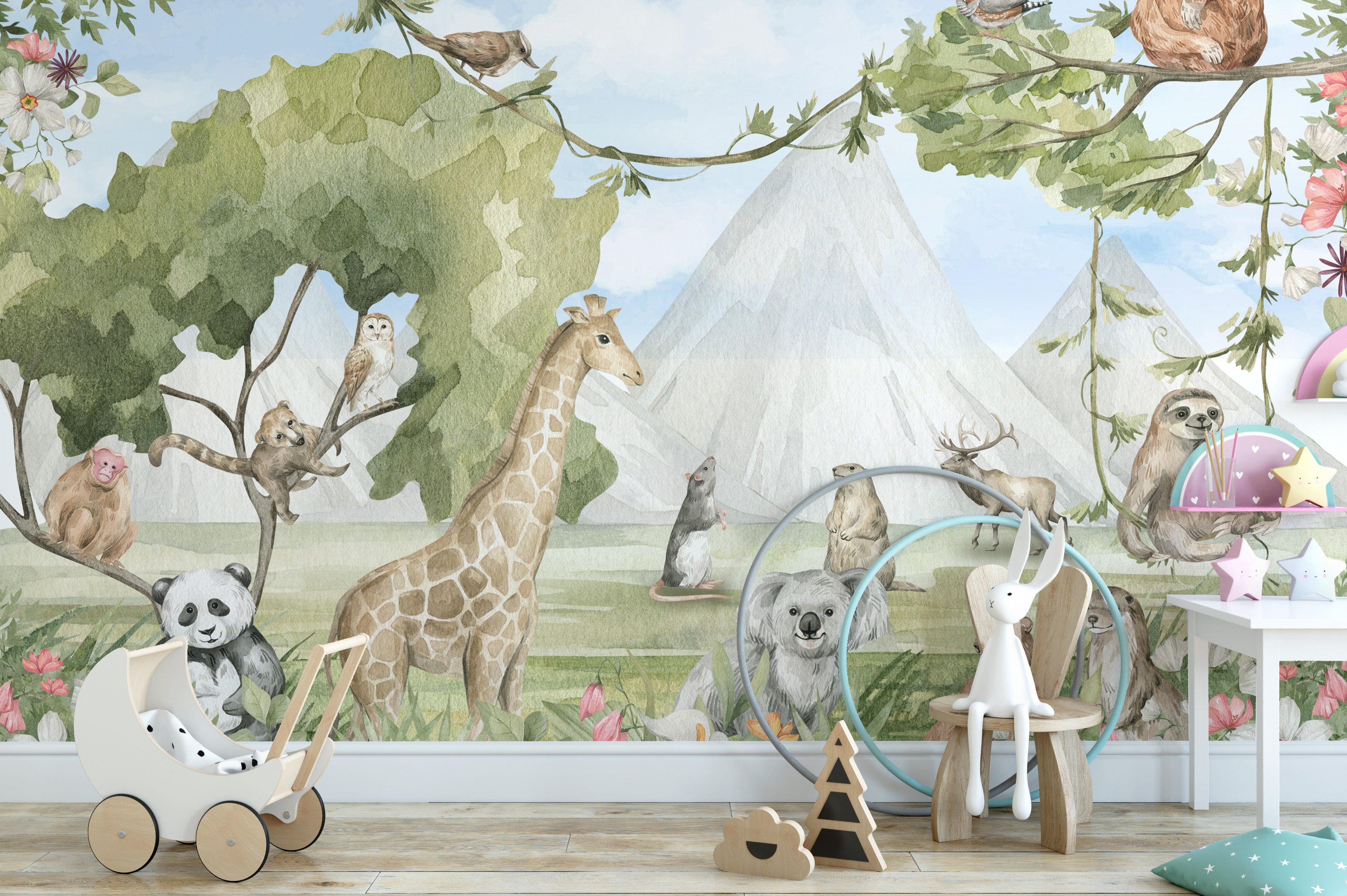 The pastoral paradise wall mural is an exquisite portrayal of nature’s serene bounty, bringing the peach of a sun-dappled meadow into your home. This mural is a masterful collage where each stroke celebrates the diversity of the jungle. As a piece of jungle wallpaper, it is brimming with life from the gentle giraffe to the wise old sloth, it represents a world where every creature plays a role in the tapestry of life. The lush greenery interspersed with vibrant flowers makes it not just a visual delight but a storytelling piece that fuels the imagination. It’s perfect for enveloping a room in the wonders of the wild, making it an ideal animal wallpaper for spaces that crave a connection with the great outdoors. This wall mural is where the whispers of the jungle meet the poetry of the meadows.