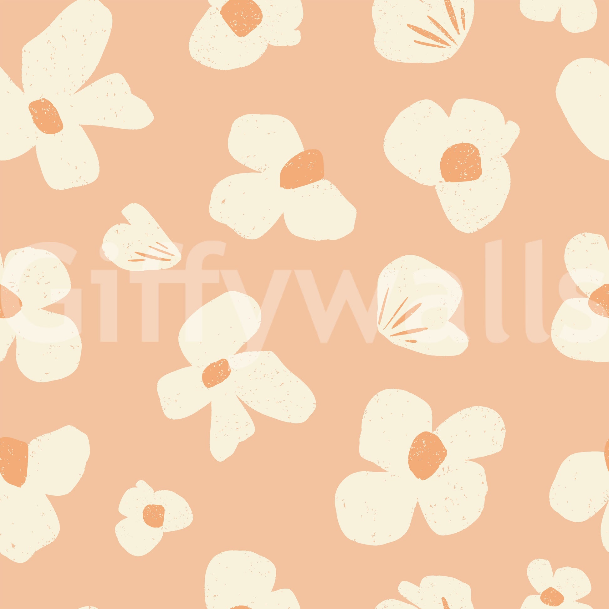 This wallpaper showcases a modern abstract floral design. The apricot background complements the off-white and light coral flower shapes, creating a balanced and sophisticated visual. The slightly imperfect, hand-drawn style of the flowers adds a touch of warmth and character. It's a perfect choice for those seeking a contemporary, understated yet stylish wallpaper that brings a touch of nature-inspired elegance to any room. Its versatile design makes it suitable for a range of interior styles, adding a calm and sophisticated feel to your space.