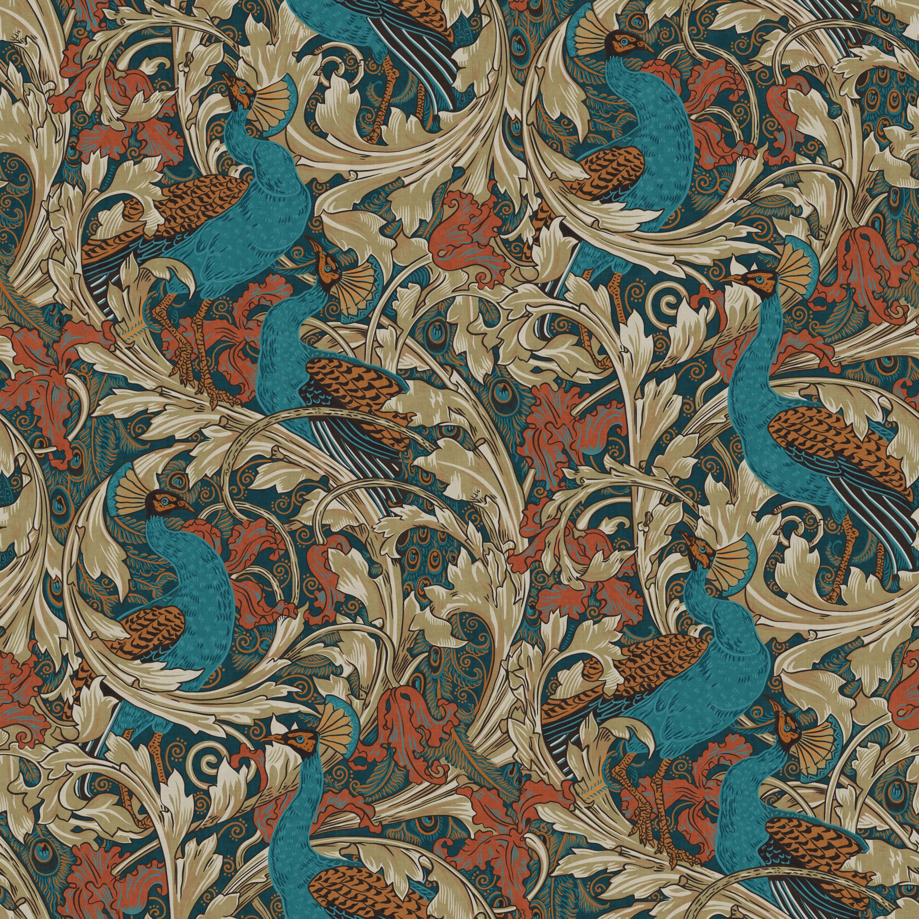 Peacock Garden by Walter Crane in teal rust mustard beige Wallpaper⁠