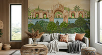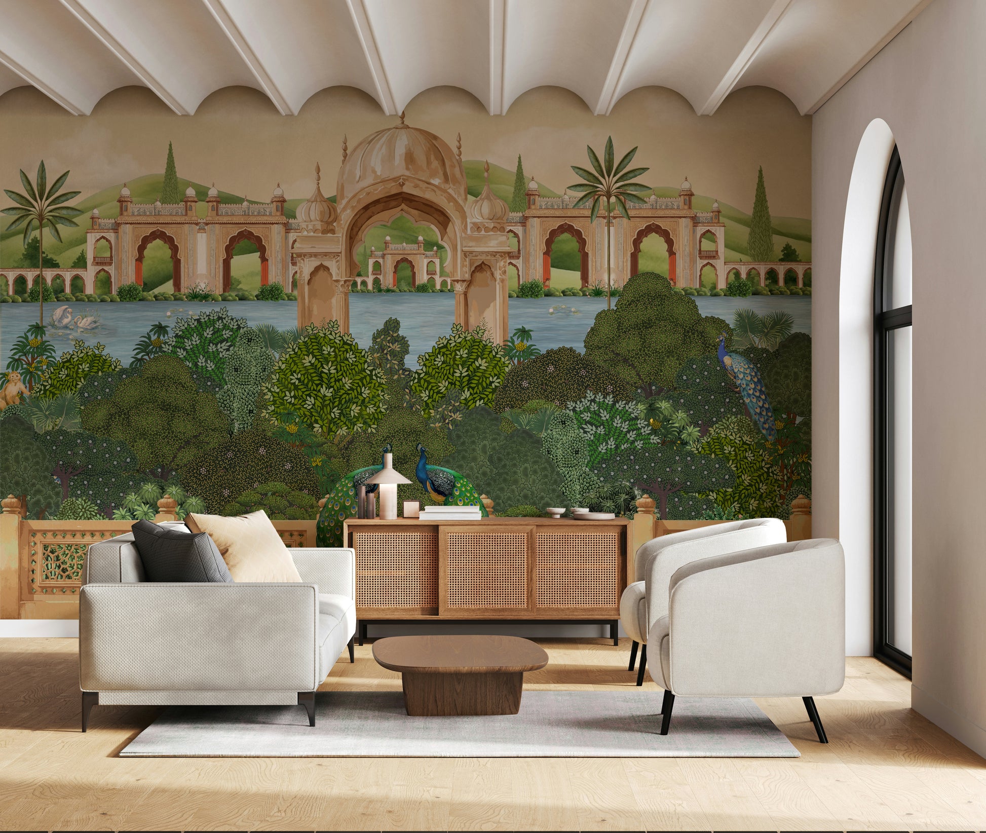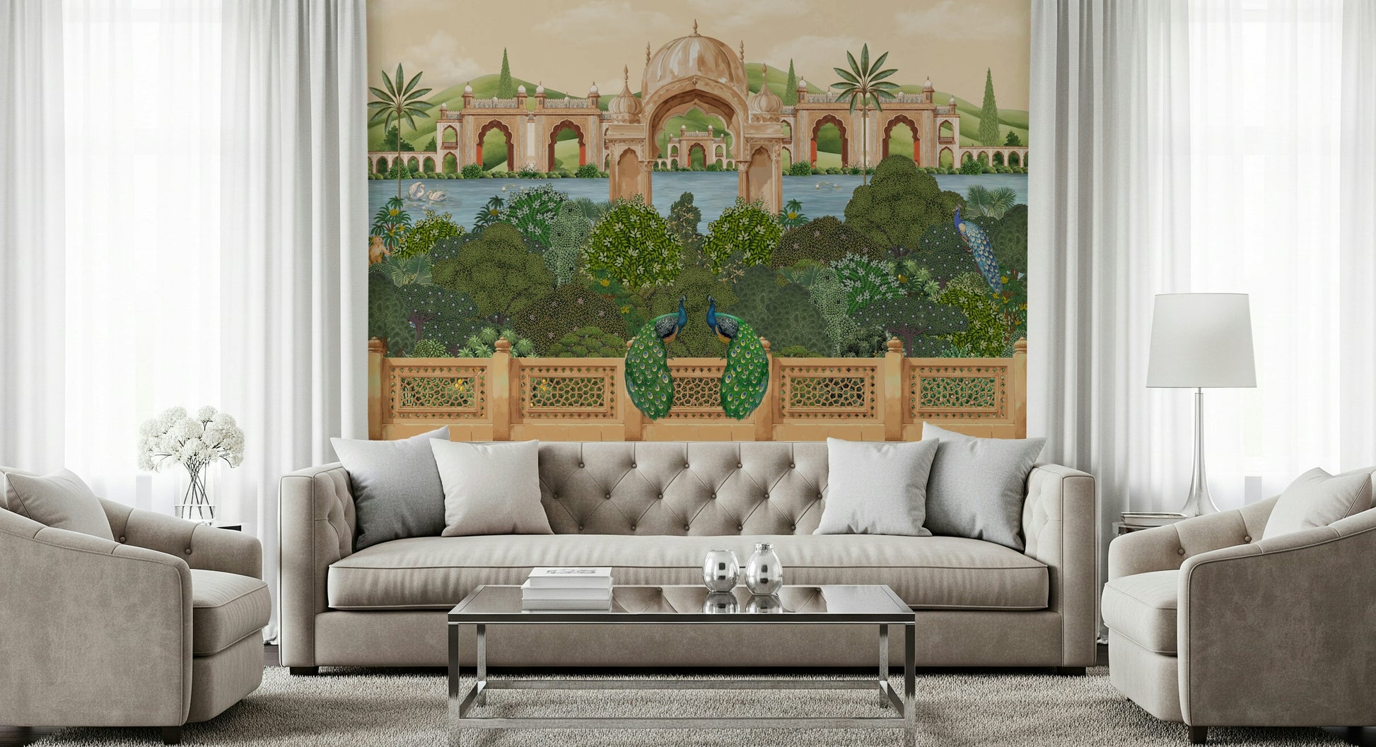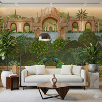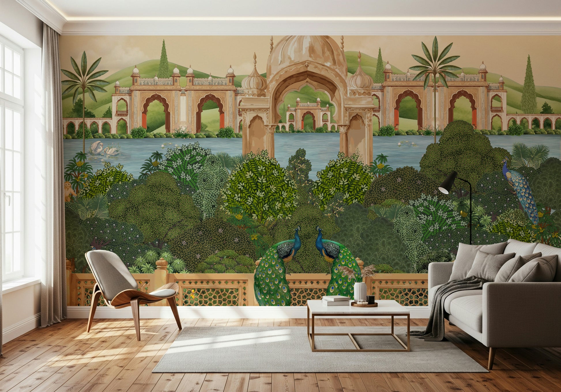 Escape to a realm of serene beauty with 'Peacock Paradise,' a stunning wall décor piece that evokes the majesty of a secluded palace garden. Ornate sandstone architecture rises majestically in the distance, reflected in the tranquil waters where swans gracefully glide. Lush, verdant foliage bursts with life, providing a vibrant tapestry against the soft, muted sky. Two regal peacocks, perched elegantly on a decorative wall, command attention with their iridescent plumage, adding a touch of exotic splendour. This panoramic view transports you to a timeless oasis, where nature and artistry intertwine. Infuse your space with the tranquil elegance and subtle drama of this captivating scene, creating a sanctuary of calm and refined beauty. Let 'Peacock Paradise' transform any room into a personal retreat, a testament to luxurious serenity.