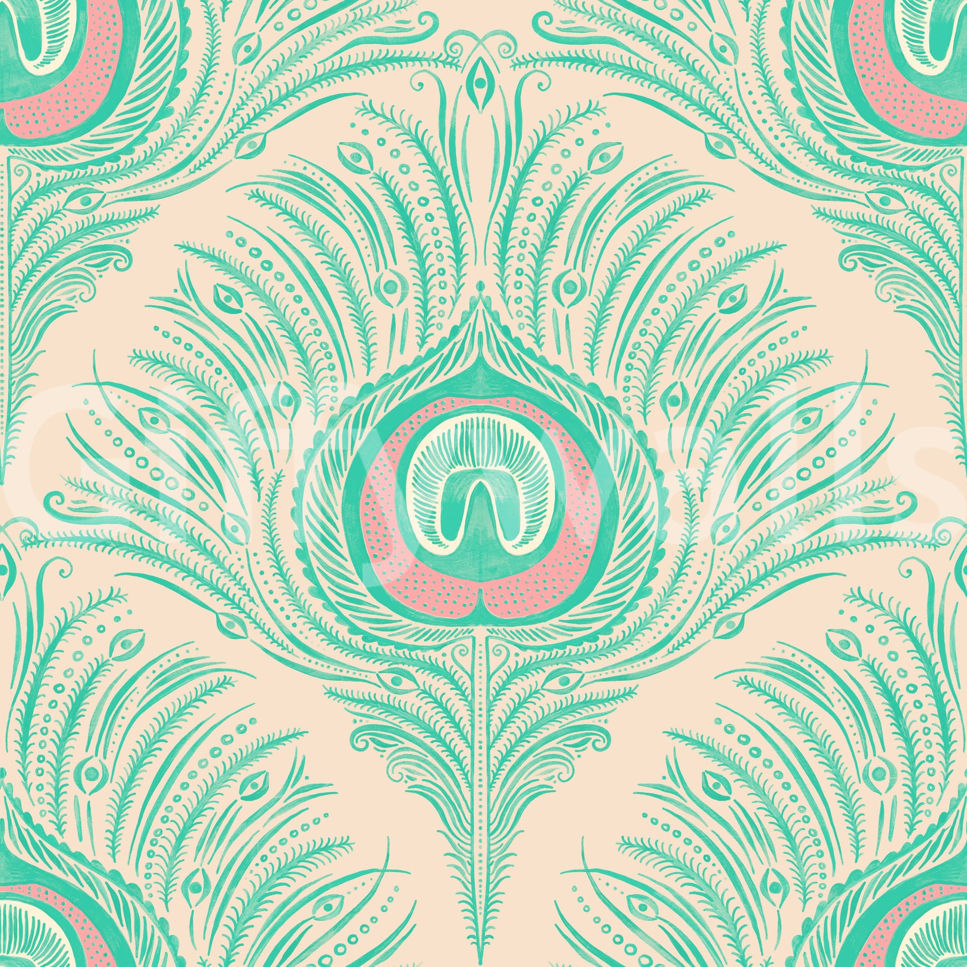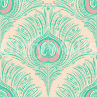Embrace the elegance of 'Peacock Plume,' a captivating wallpaper design. Intricate teal and blush pink stylized feathers create a mesmerizing pattern against a soft beige backdrop. The design evokes a sense of serene sophistication, featuring meticulously rendered details in a whimsical art style. Each feather boasts unique, eye-like embellishments, adding a touch of mystique and intrigue to this beautifully balanced, symmetrical composition. Perfect for adding a touch of refined artistry to any digital device.