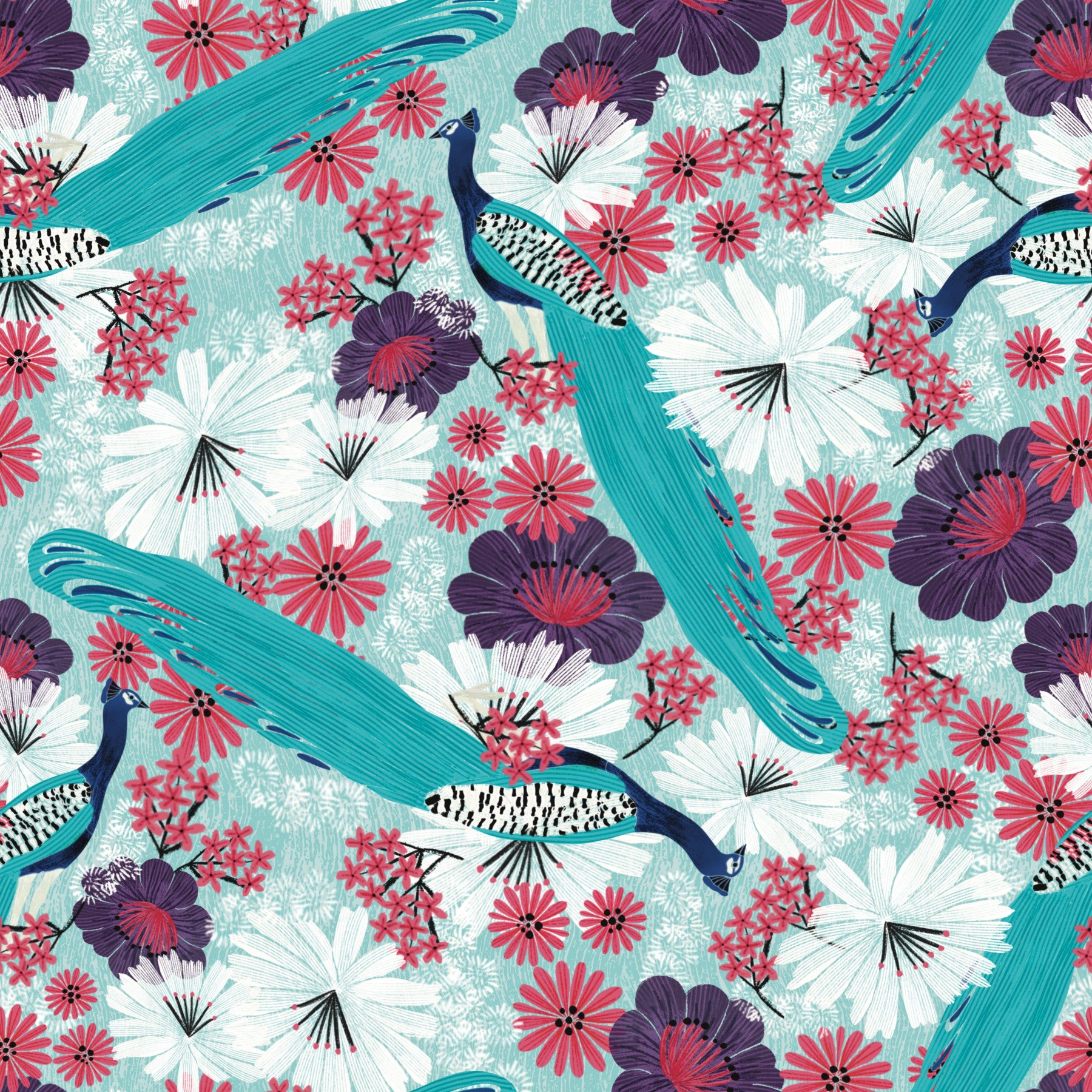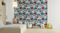 Stroll through a vibrant garden with "Peacock Promenade - Blue," a wallpaper that blends elegance with whimsical charm. This delightful design features majestic peacocks gracefully interspersed amongst a profusion of stylised flowers. A calming blue backdrop sets the stage for a stunning display of white, pink and purple blossoms, creating a cheerful and captivating atmosphere. The striking turquoise tail feathers add a pop of colour and a touch of artistry to the design. The stylised patterns and brushstroke textures provide depth and a contemporary aesthetic. Bring a touch of sophisticated nature into your space with this charming and visually rich design – perfect for creating a serene yet stylish environment.