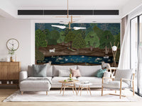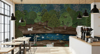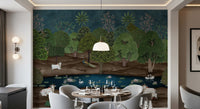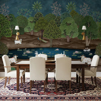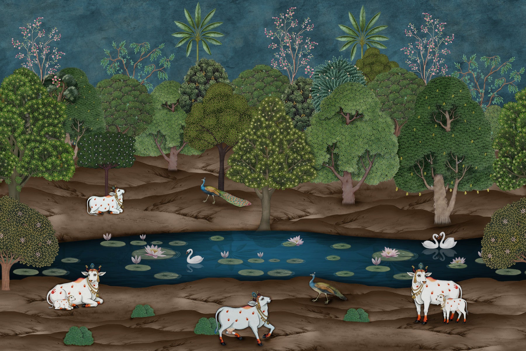 Transform your living space with this exquisite Pichwai-inspired wallpaper for walls. It showcases a lush, stylised forest scene in rich greens and earthy browns, under a deep teal sky. Sacred cows adorned with delicate handprints and ornate jewellery, serene swans, and majestic peacocks inhabit this tranquil landscape. Pink lotus blossoms float gracefully on a calm blue pond. This traditional Indian art style brings an air of serenity and opulence to any room. Ideal for living rooms, dining areas, or studies, the intricate details and vibrant yet harmonious colour palette create a captivating feature wall. It invites peaceful reflection and adds unique cultural elegance to your interior design.