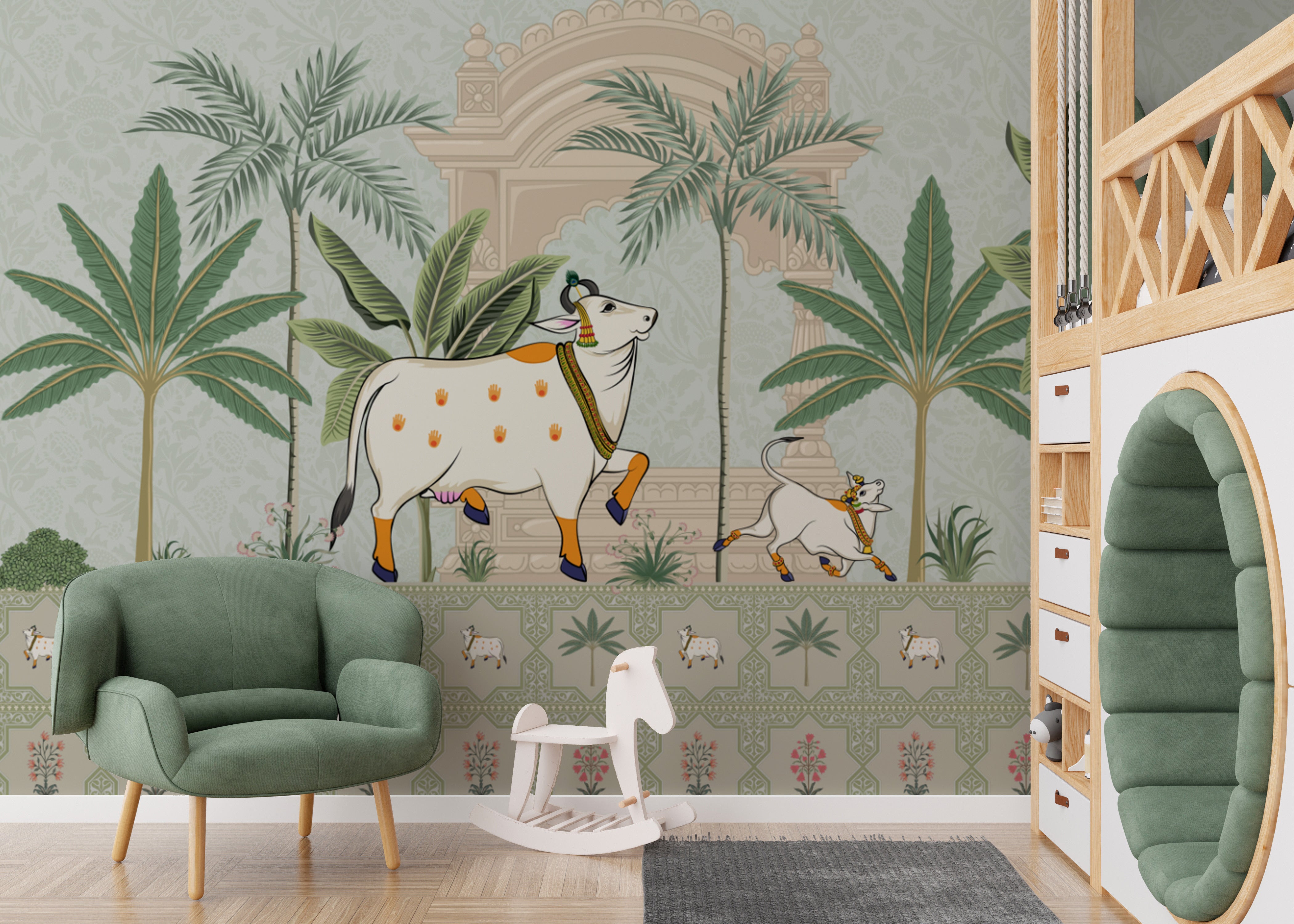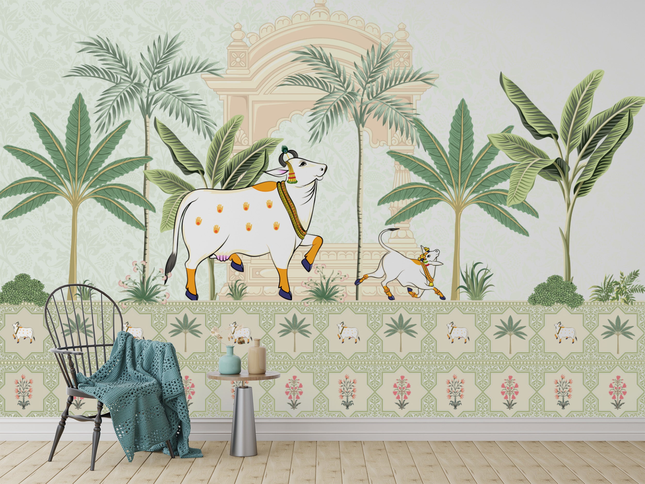Bring cultural elegance to any setting with this Pichwai Sacred Cow Wallpaper Mural. Inspired by traditional Indian heritage, this design features sacred cows adorned with intricate patterns, lush palm trees and a royal palace backdrop. The soft pastel green tones create a vintage aesthetic that adds depth and character. Crafted with Pichwai painting influences, it reflects spiritual richness and timeless charm. Ideal for living rooms, meditation spaces, and heritage interiors, this Indian palace wallpaper blends beautifully with classic and modern themes. Enhance walls with this traditional Indian wall art, capturing the essence of sacred beauty.