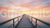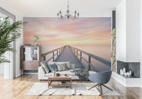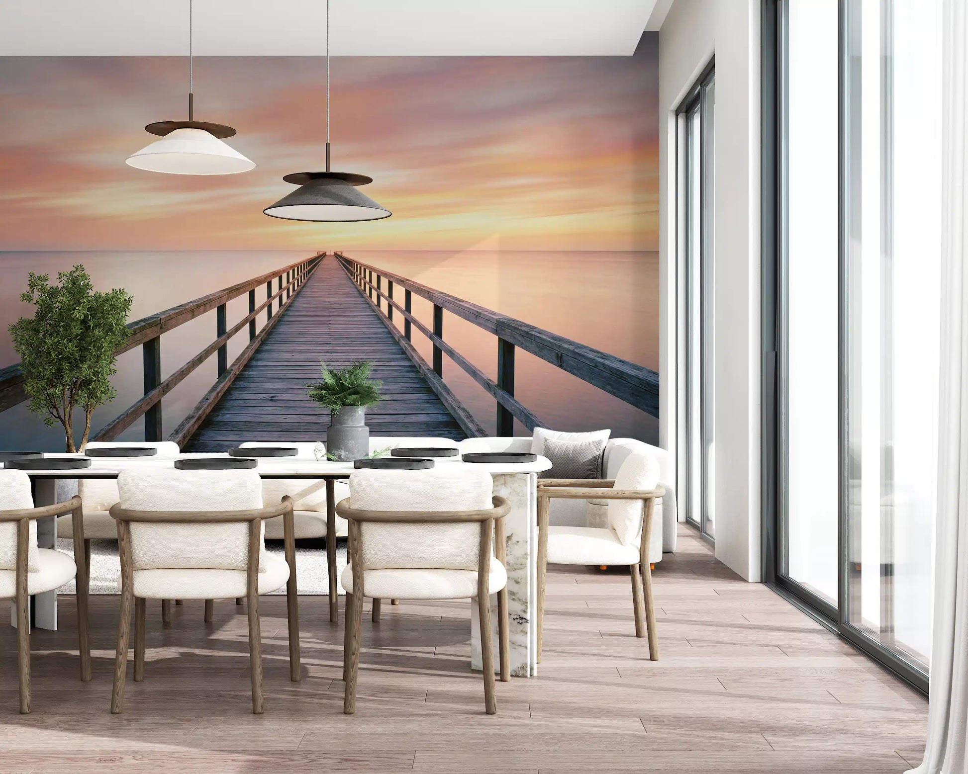 Invite serenity into your living spaces with this captivating wallpaper for walls. A wooden pier stretches towards the horizon, meeting a soft, pastel sky. Peach, pink, and gentle blue blend seamlessly, creating a calming, dreamlike atmosphere. The design brings a sense of escape and tranquility, working beautifully in bedrooms to promote restful sleep, or in living rooms to foster relaxation. The long perspective of the pier adds depth, making rooms feel more spacious. Infuse your home with the quiet beauty of a coastal dawn.