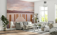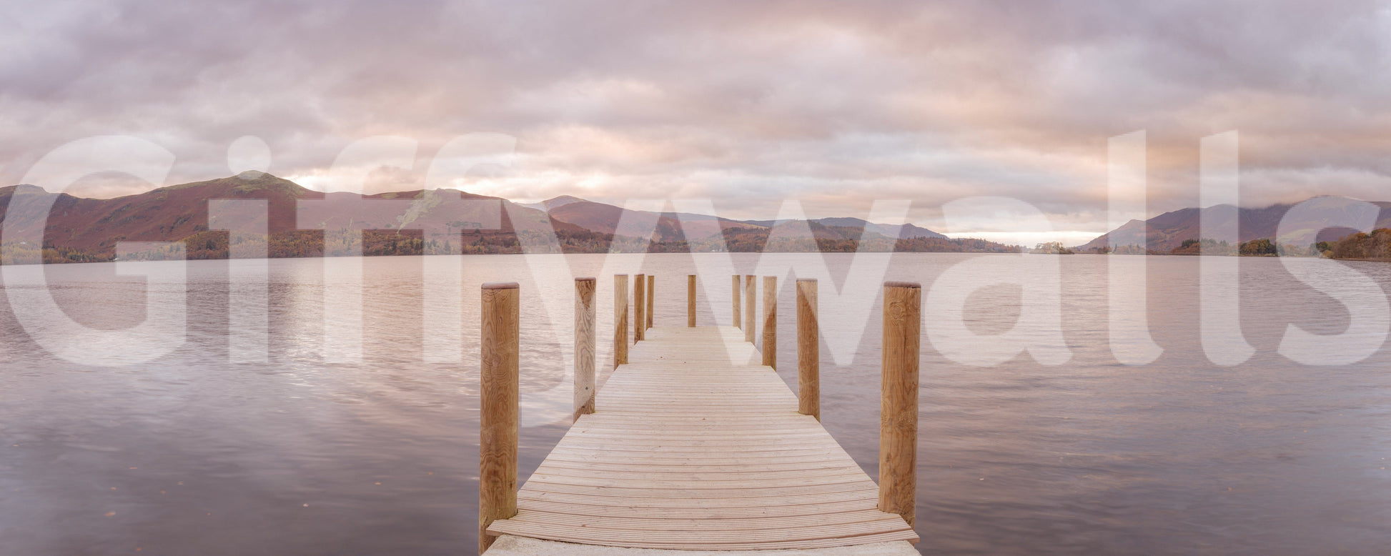 Derwentwater pier, Lake District. Step into a tranquil scene with this calming lake image. It features a wooden pier leading out into calm waters, framed by distant mountains painted with soft, earthy tones. The serene atmosphere creates an instant feeling of peace, perfect for bedrooms, bathrooms, or any space where you want to invite relaxation. Use this wallpaper for walls to bring a touch of nature’s calm to your living space and complement minimalist interiors.