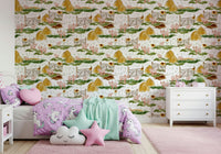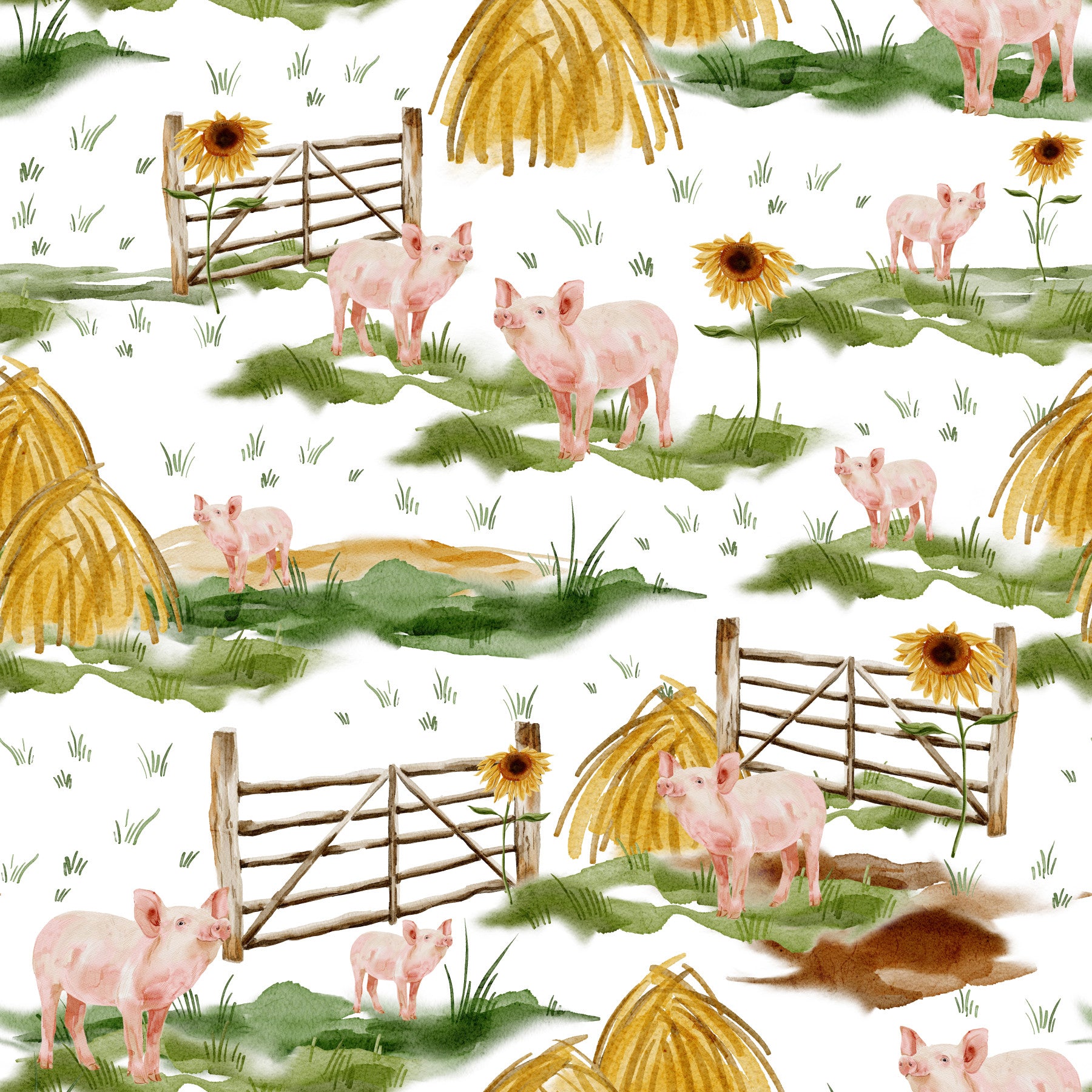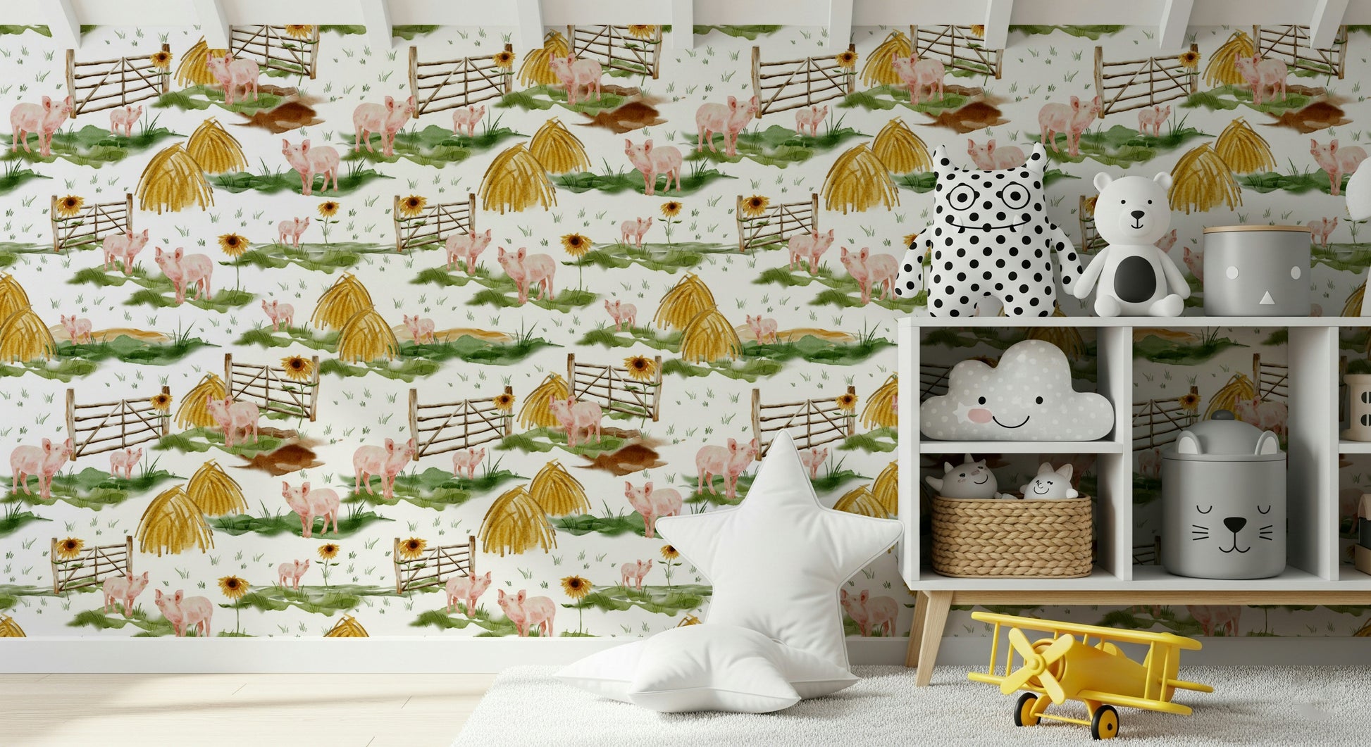 Bring rustic charm to your walls with this delightful watercolour wallpaper by Uta Naumann. This pattern features adorable pink pigs, golden hay bales, and cheerful sunflowers. Soft greens and browns create a tranquil, countryside aesthetic. The playful design works well in a kid's room, nursery, or kitchen. With its hand-painted feel, this wallpaper adds a touch of warmth and whimsy to any space. Use this wallpaper for walls to create a heartwarming feature wall in any room. It pairs perfectly with farmhouse or cottage-style interiors.