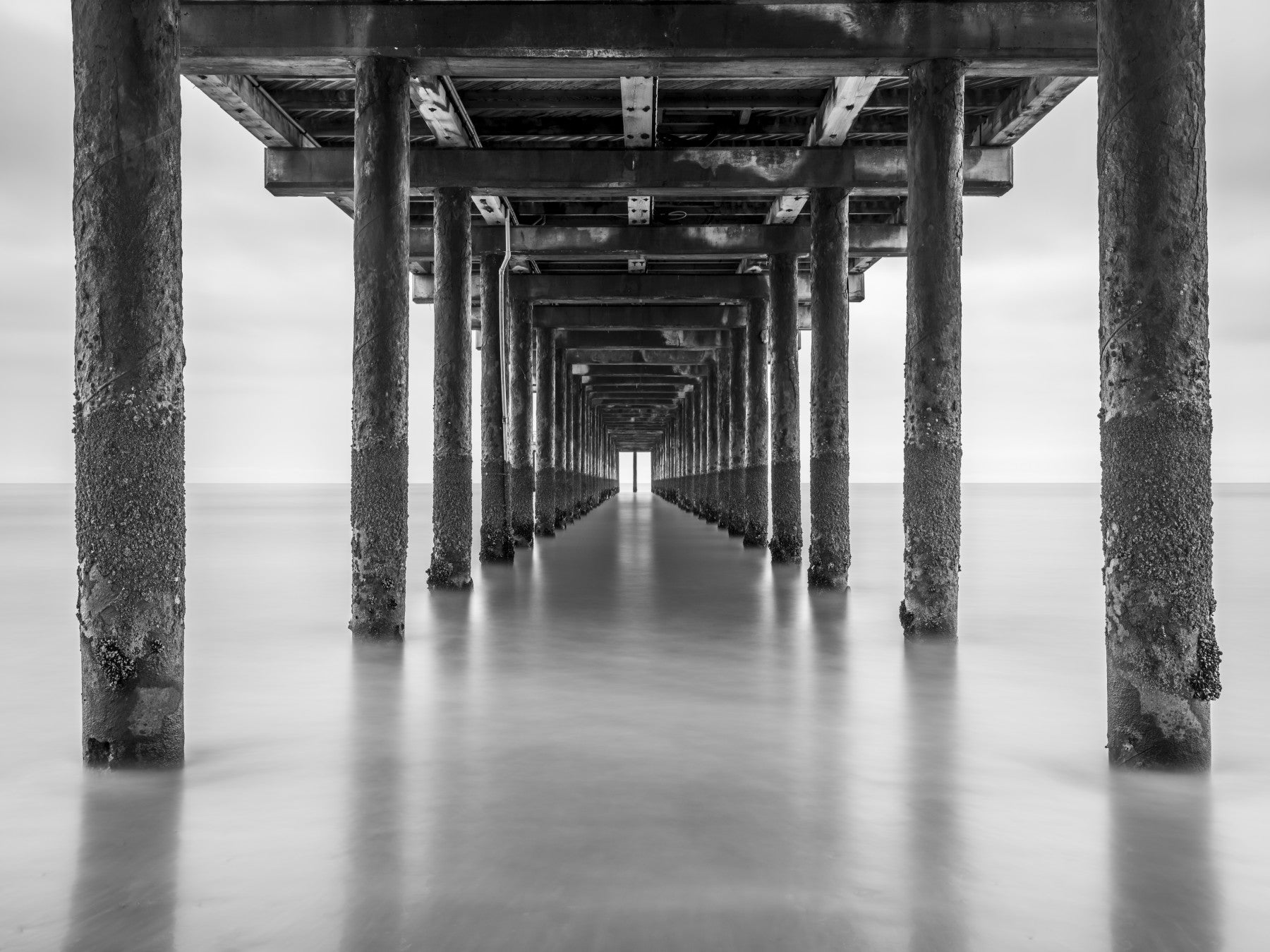 Adorn your walls with the Pillars Under a Pier Wall Mural, a captivating and profound tribute to architectural grandeur and serene coastal beauty. This exquisite mural wallpaper features a stunning black and white photographic view looking directly down the long, receding line of pillars supporting a pier, extending into calm, reflective waters. The symmetrical composition and long exposure effect on the water create an ethereal and contemplative visual statement, drawing the eye towards a distant light or opening. Designed to bring a touch of sophisticated elegance and peaceful allure, this wallpaper for walls is ideal for living rooms, studies, or any space desiring a bold artistic statement and a unique flair. Its intricate details and harmonious grayscale palette will beautifully elevate your interior, offering a continuous flourish of captivating design. Easy to hang and durable, it's a simple way to introduce sophisticated appeal into your home.