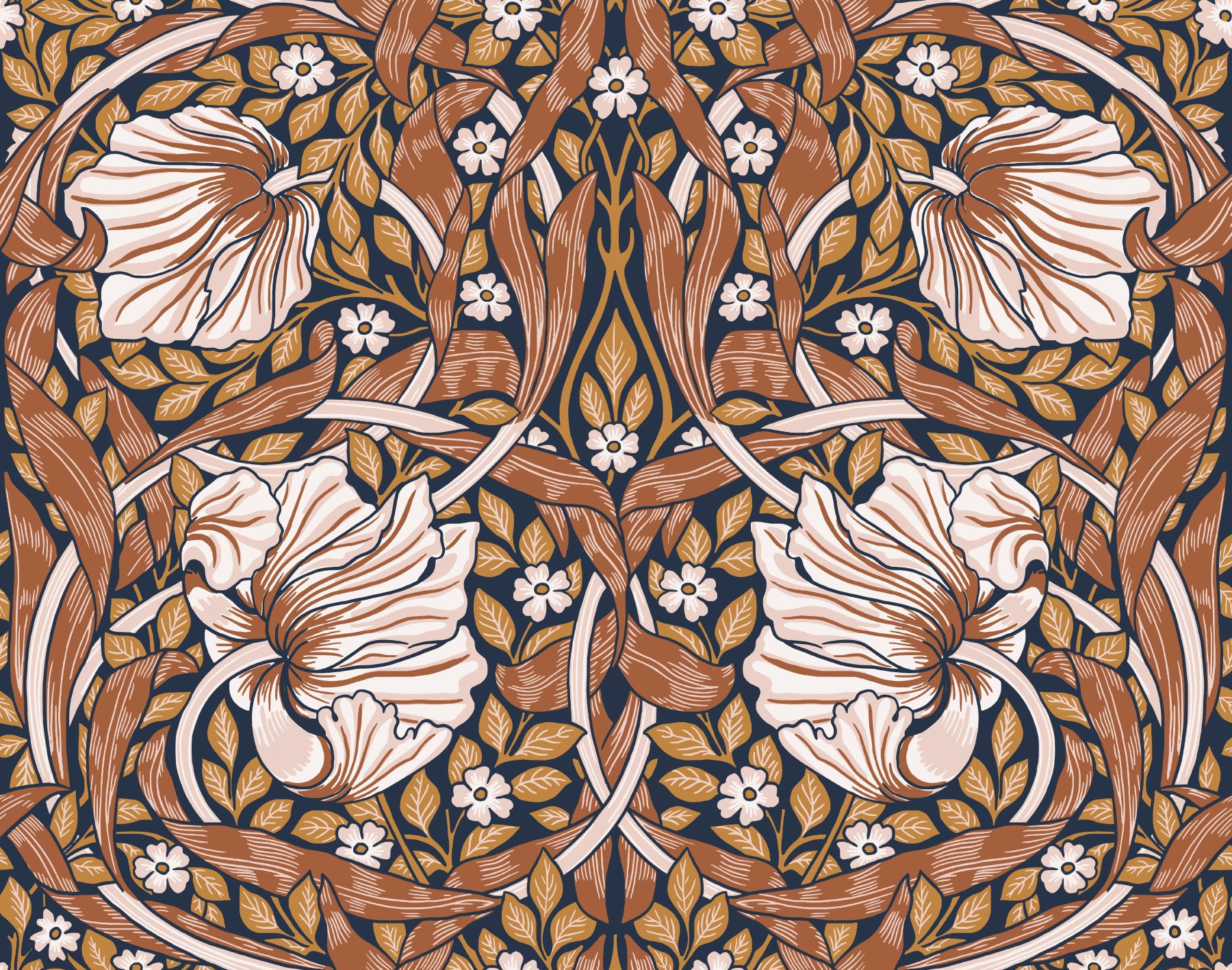 Immerse yourself in the timeless elegance of "Pimpernel by William Morris 19." This captivating wallpaper showcases a breathtaking Art Nouveau design, featuring a richly textured interplay of stylized pimpernel blossoms in soft blush and creamy white. Intricate, flowing brown and gold leaves and ribbon-like tendrils create a mesmerizing pattern against a deep navy background. The design's delicate details and harmonious color palette evoke a sense of refined sophistication and tranquil beauty, perfect for adding a touch of classic artistry to any space. This wallpaper is a testament to William Morris' enduring legacy of exquisite floral patterns.
