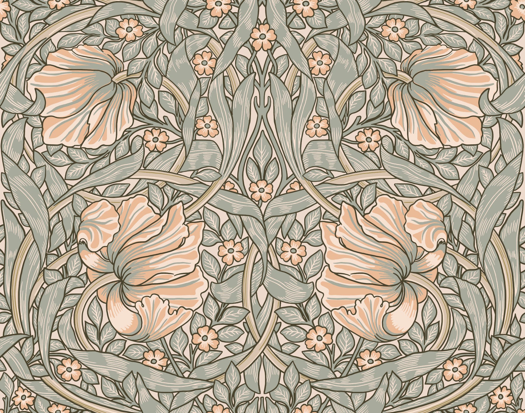 Embrace the timeless elegance of "Pimpernel by William Morris 20." This wallpaper showcases a captivating Art Nouveau design, featuring intricately detailed peach-toned pimpernel blossoms intertwined with flowing, sage-green foliage. The design's rhythmic curves and symmetrical composition create a sense of serene sophistication. Subtle variations in shading add depth and texture to the floral motifs, bringing a classic yet contemporary feel to any space. The overall effect is a calming and sophisticated atmosphere, perfect for creating a refined and stylish environment. Inspired by the iconic William Morris style, this wallpaper offers a harmonious blend of nature's beauty and artistic mastery.