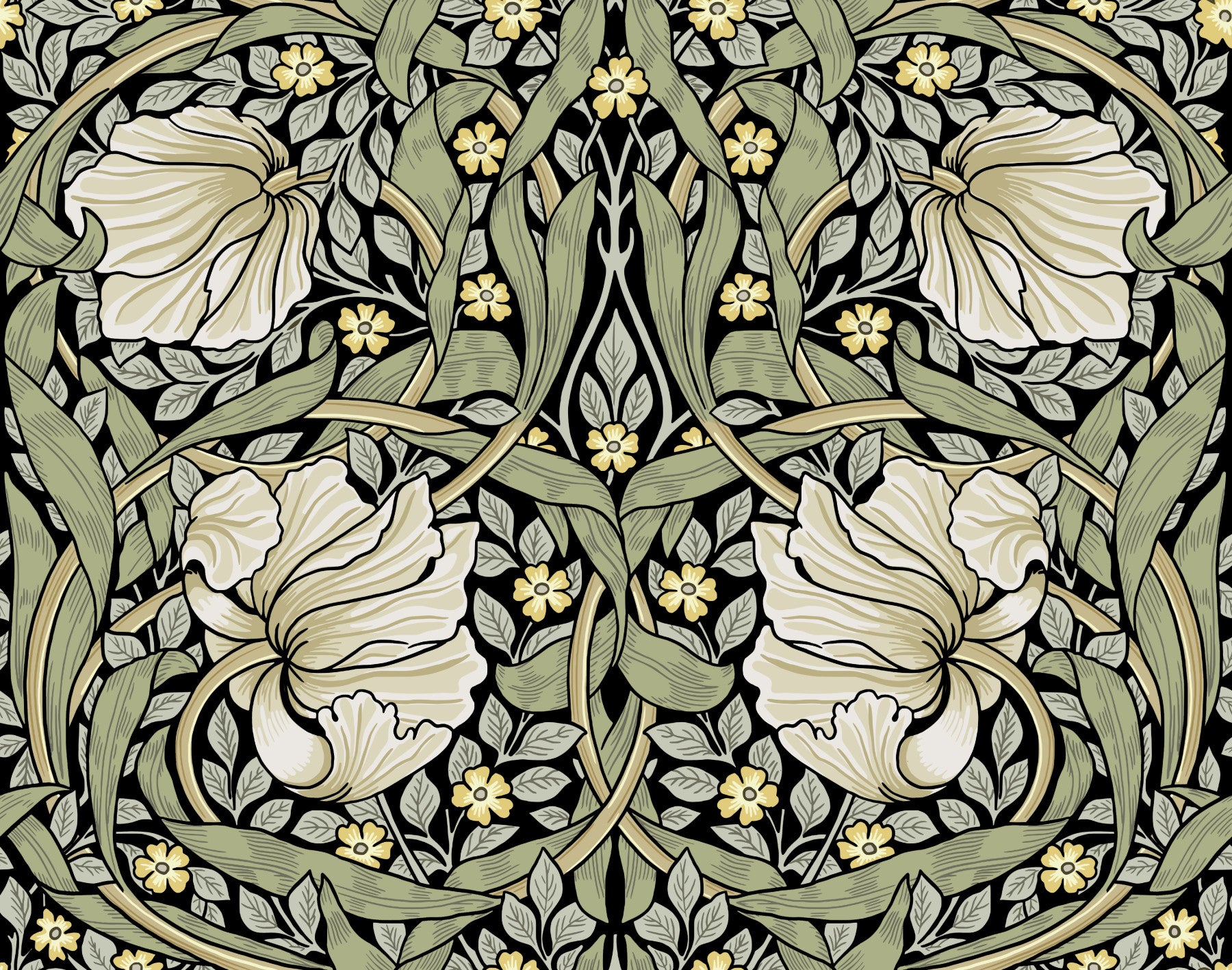 Immerse yourself in the timeless elegance of "Pimpernel by William Morris 28." This wallpaper design showcases a captivating interplay of stylized pimpernel flowers and lush foliage, rendered in a sophisticated palette of muted greens and creamy whites against a deep black background. The intricate, flowing lines and symmetrical arrangement create a sense of both organic movement and structured harmony, reflecting the characteristic style of William Morris's Arts & Crafts movement. This wallpaper offers a sophisticated and refined aesthetic, perfect for adding a touch of classic beauty to any modern space. The detailed botanical illustrations evoke a feeling of tranquility and natural grace, making it a perfect choice for those seeking an elegant and timeless backdrop.