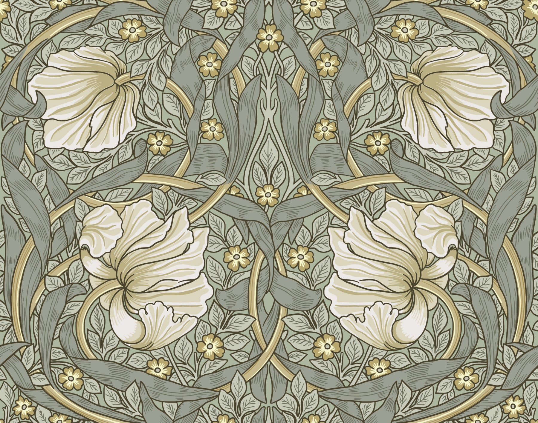 Indulge in the refined elegance of 'Pimpernel by William Morris 2,' a digital wallpaper echoing the master's artistry. This design showcases a captivating interplay of stylized cream-colored pimpernel blossoms, meticulously rendered with detailed petals and delicate veins. These floral beauties are gracefully entwined within a lush tapestry of curving leaves and smaller blossoms in muted greens and golds. The intricate, almost architectural, arrangement of the botanical motifs creates a sense of rhythmic symmetry and timeless sophistication, perfect for adding a touch of Art Nouveau charm to your digital space. The subtle color palette and the rich detailing create a tranquil and sophisticated atmosphere.