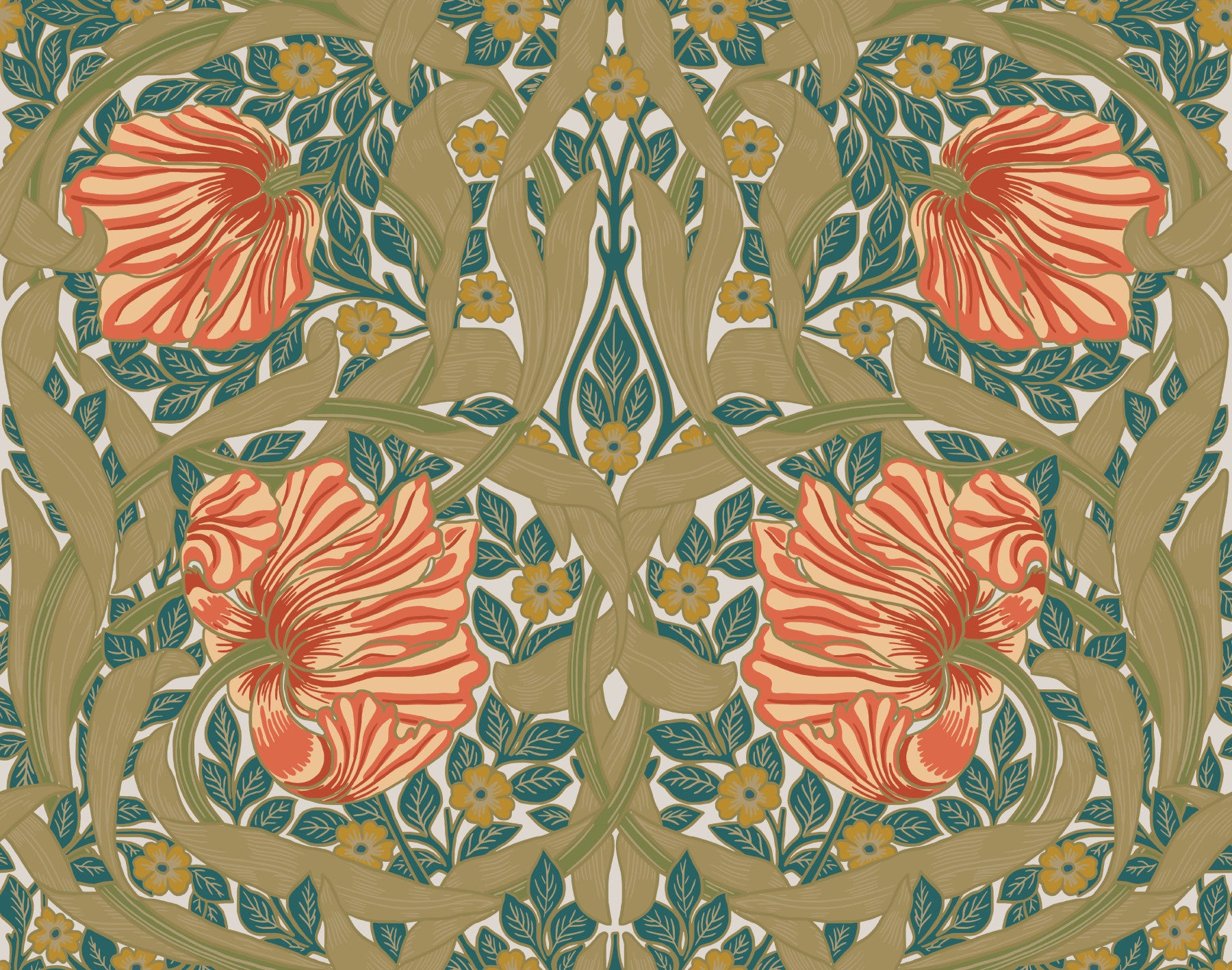 Indulge in the opulent beauty of "Pimpernel by William Morris 6," a captivating wallpaper design. This iteration showcases a mesmerizing array of stylized coral-toned pimpernels, their petals elegantly rendered with delicate lines, nestled amidst a lush tapestry of teal and olive-green foliage. Intricate, curving stems intertwine, creating a sense of graceful movement and depth. Small, golden yellow flowers punctuate the design, adding a touch of vibrant contrast to the sophisticated color palette. The overall effect is one of refined elegance and timeless artistry, reminiscent of William Morris's signature style, perfect for adding a touch of Victorian charm to any space.