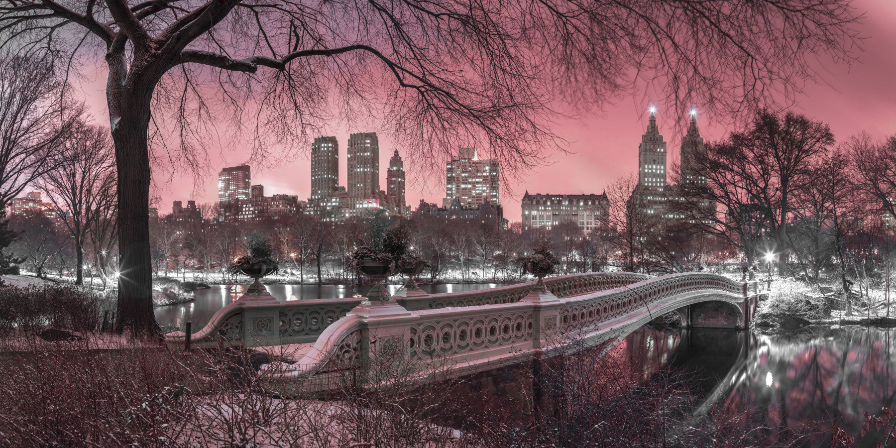 This wallpaper captures the enchanting beauty of Central Park at dusk in winter. A unique pink hue dominates the sky, casting a warm glow on the snow-covered Bow Bridge and the surrounding trees. The city skyline rises in the background, its lights twinkling against the vibrant sky. The scene is tranquil and peaceful, perfect for creating a relaxing atmosphere in any room. The contrast between the soft pink sky and the crisp white snow creates a visually striking image, ideal for adding a touch of elegance and serenity to your space. The intricate details of the bridge and the reflections on the water add to its captivating charm.