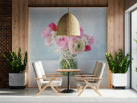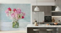 Bunch of mixed flowers in glass bottle. Introduce delicate charm into your space with this enchanting floral wallpaper for walls. This design features a beautiful bouquet of pink ranunculus, vibrant tulips, and white daffodils, all delicately arranged in a textured glass vase. The soft, watercolour-like backdrop adds a dreamy and serene quality to the scene. This wallpaper creates a calming atmosphere, perfect for bedrooms, living rooms, or even a powder room seeking a touch of romantic elegance. The colour palette of blush pinks and subtle whites works well with a range of décor styles, from classic to modern farmhouse. Its gentle beauty complements and enhances existing furnishings.
