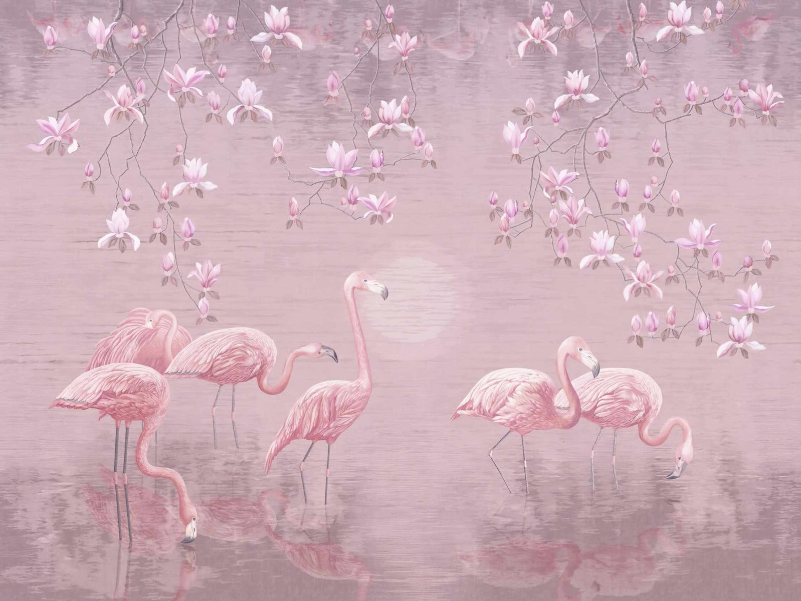 Dive into a world of elegance with the pink magnolia flamingo haven mural wallpaper. Perfectly suited for those who desire a touch of whimsy in their decor, this living room wallpaper merges the delicate beauty of pink magnolia blossoms with the graceful allure of flamingos. The intricate design creates a dreamy atmosphere, making it a standout choice for those wanting to introduce a hint of nature and charm. Make a statement in your home with this enchanting pink flamingo wallpaper, where every detail whispers luxury and poise.