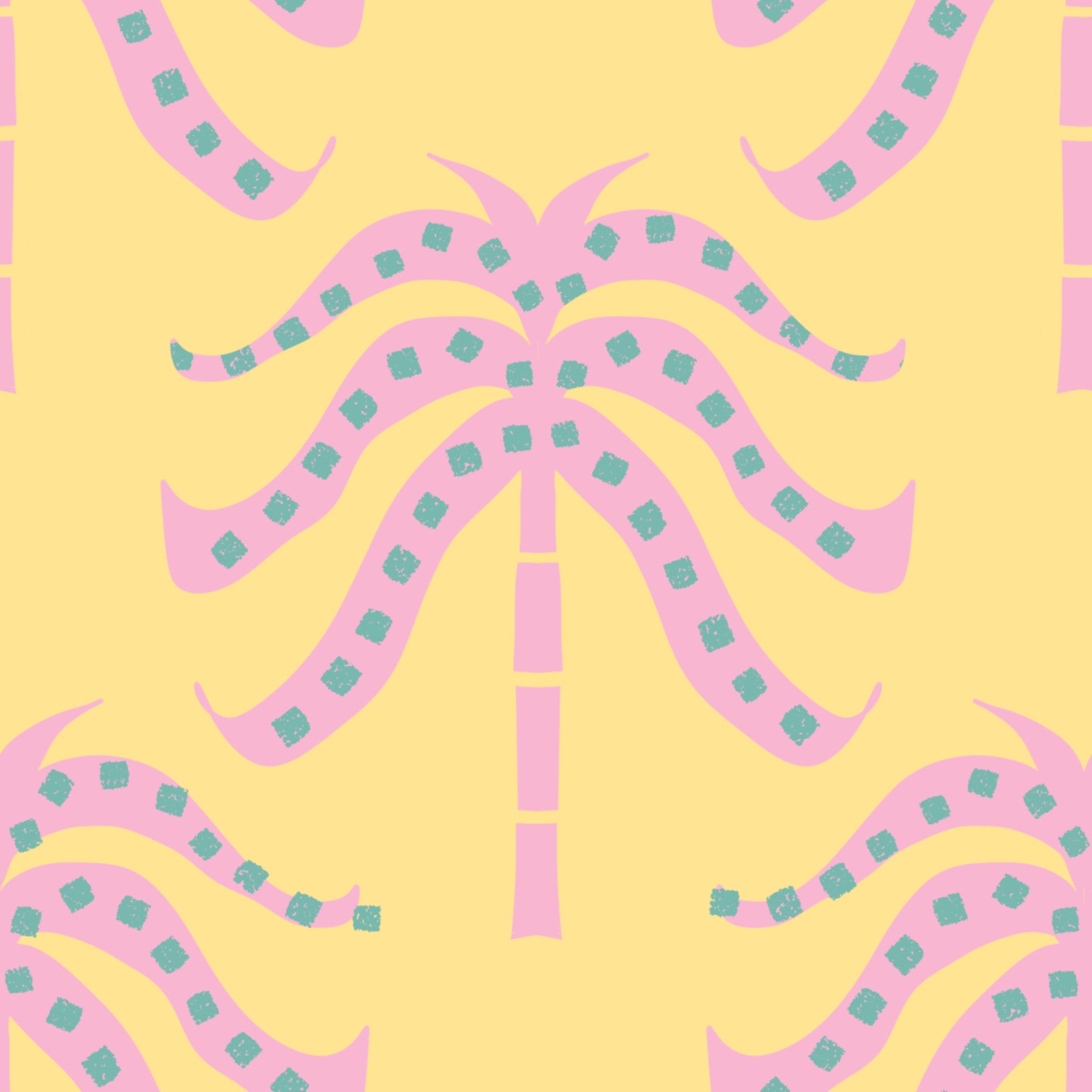 Escape to a retro paradise with Pink Palms Butter Yellow a playful wallpaper that evokes a sense of sun-drenched nostalgia. This design features stylized, pastel pink palm trees adorned with teal squares, set against a background of warm, butter yellow. The simplistic yet eye-catching pattern creates a cheerful and inviting atmosphere, perfect for adding a touch of whimsy to any room. The overall effect is reminiscent of vintage postcards and mid-century modern aesthetics, offering a unique and vibrant twist on tropical decor. Bring the breezy vibes of a carefree vacation into your home with this delightful and unexpectedly chic wallpaper.