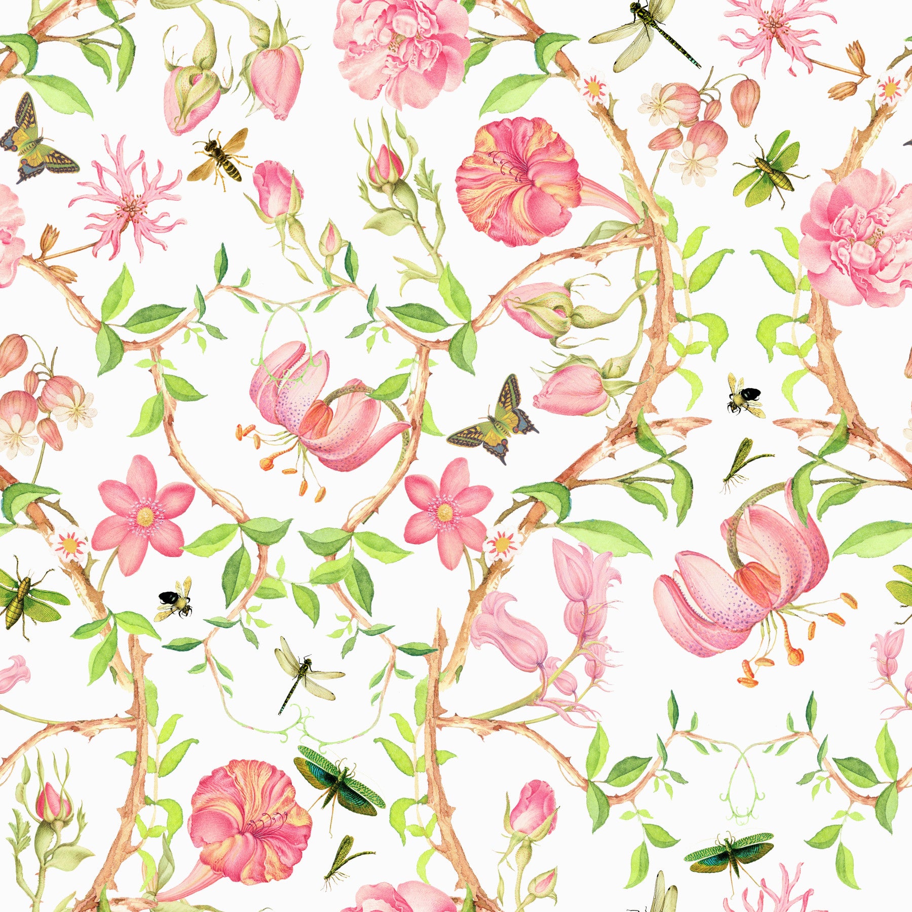 Immerse yourself in a world of delicate beauty with this stunning wallpaper. A breathtaking array of pink roses, lilies, and other wildflowers, rendered in exquisite watercolor detail, creates a vibrant yet tranquil scene. The seamless pattern is accented by charming butterflies and dragonflies, adding an element of playful sophistication. The soft pink palette and delicate artwork make it ideal for creating a peaceful and romantic ambiance in bedrooms, living rooms, or any space that calls for a touch of elegant femininity. This wallpaper exudes a sense of delicate beauty, adding a touch of paradise to your living space.