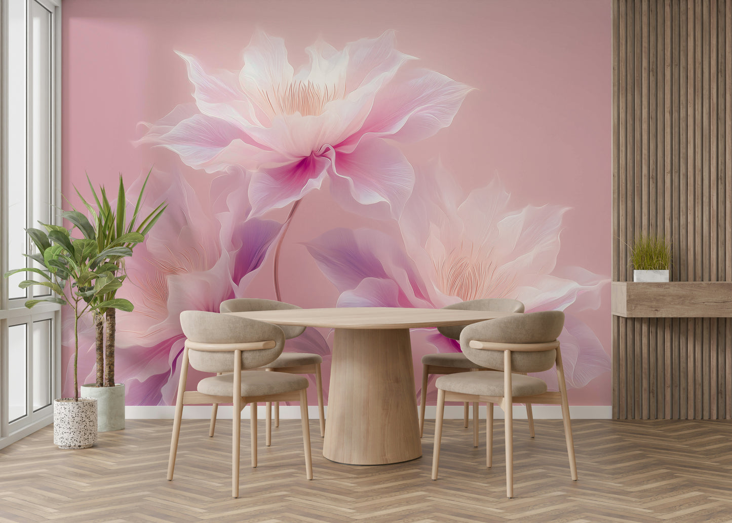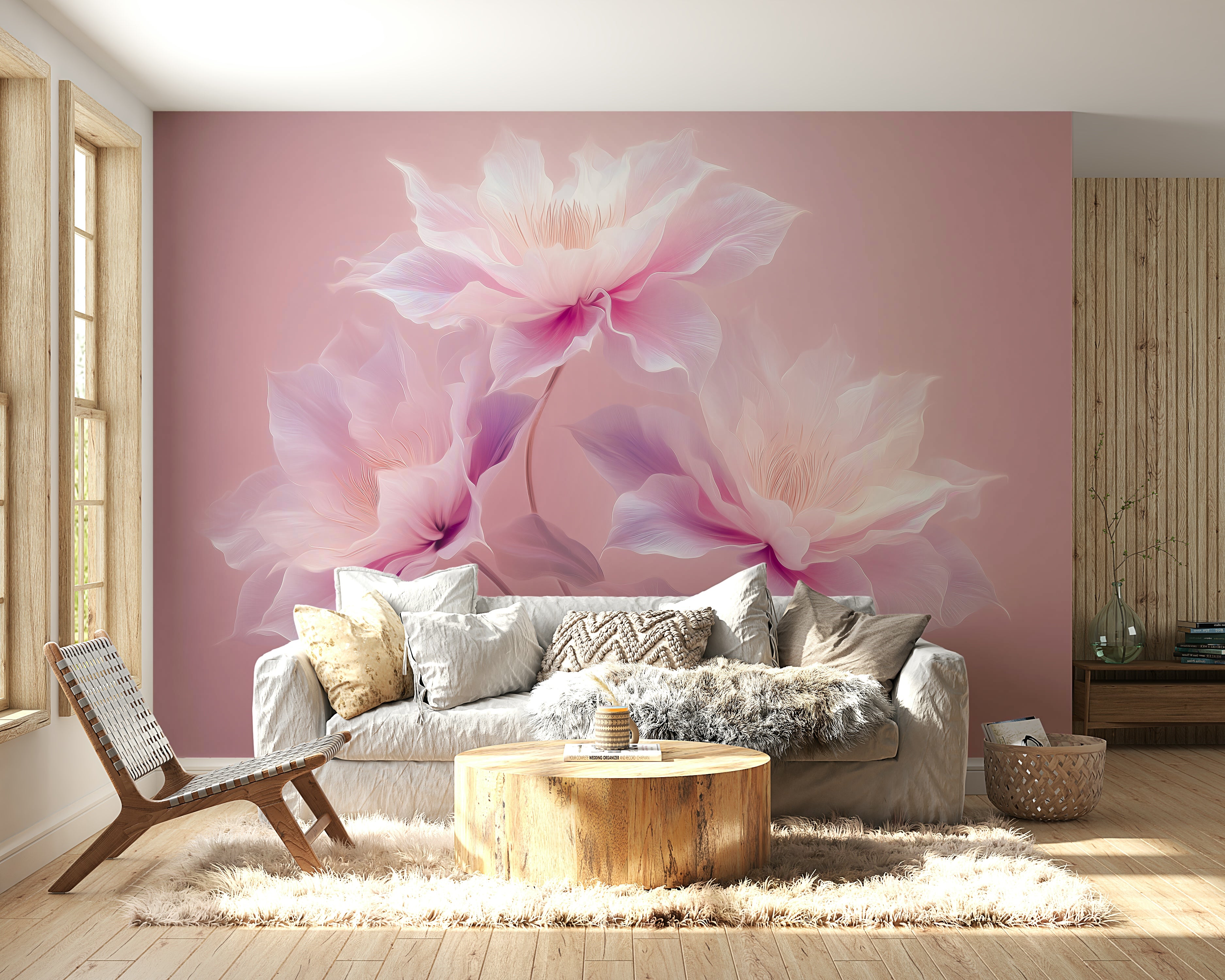 Pink Petal Dreams Floral Design Wall Mural features soft blooming florals in dreamy pastel shades of blush and lilac on a pink background. This mural wallpaper creates a calm and graceful look, perfect as wallpaper for walls in bedrooms, dressing areas, or quiet corners. The delicate petal details and flowing shapes offer a smooth, airy feel without too much pattern. The soft design works well with minimal furniture, velvet textures, or white accents. This wall mural is ideal for those who enjoy gentle florals and soft color palettes that make the room feel calm and light.