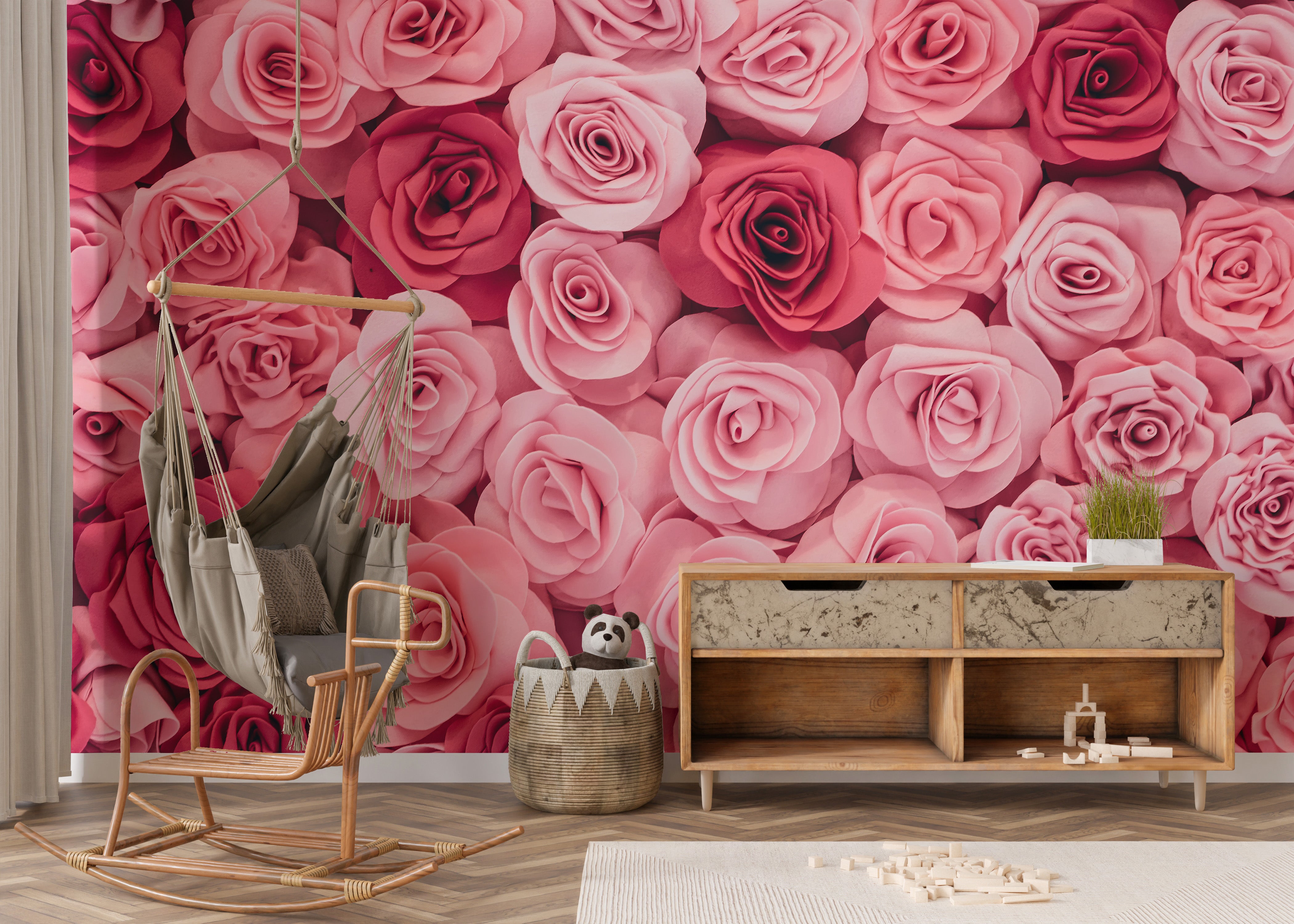 Lush pink roses wallpaper mural for a floral-inspired space.