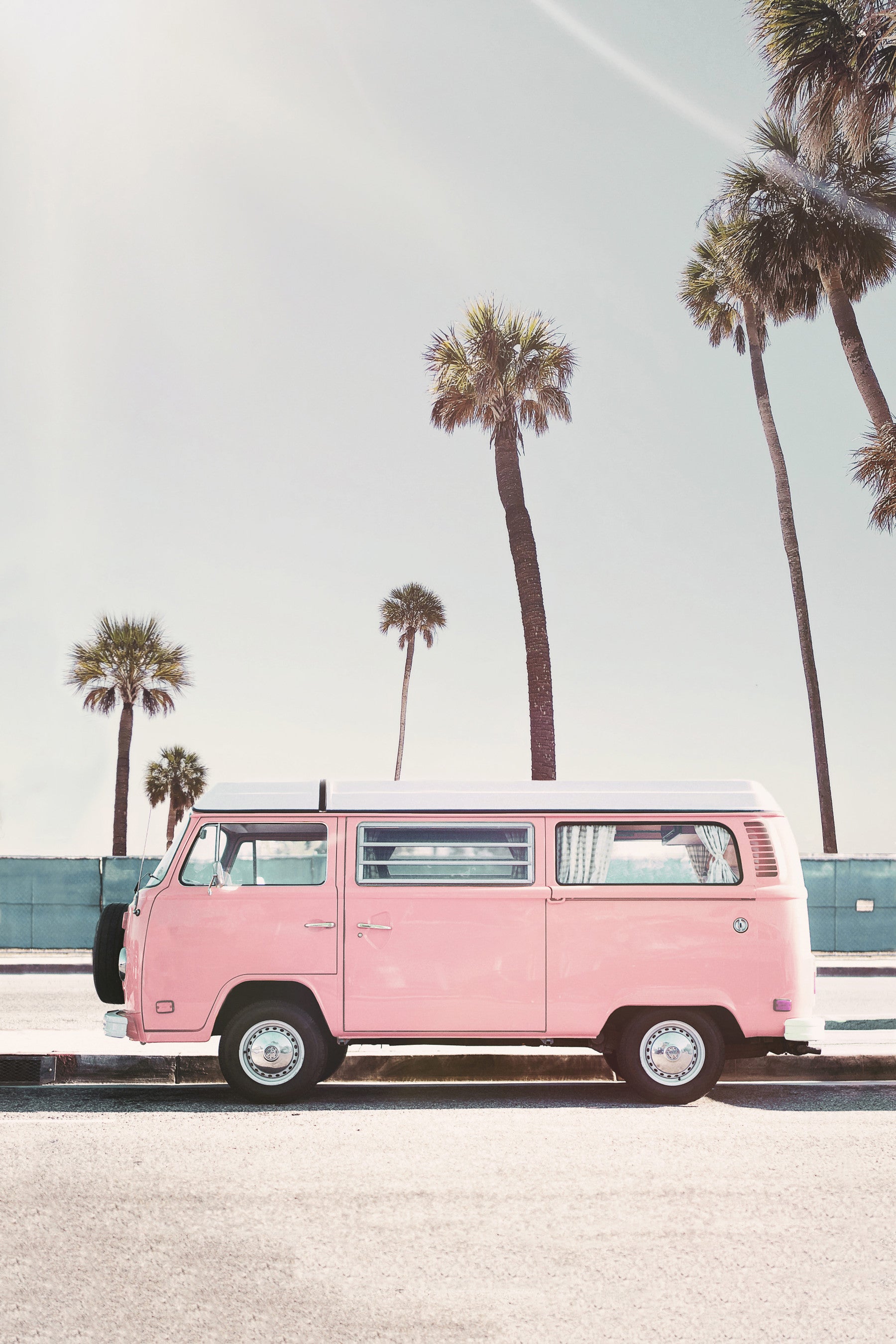 Escape to paradise with this dreamy wallpaper featuring a pastel pink vintage Volkswagen van parked under a sun-drenched sky, framed by swaying palm trees. The soft, filtered light and serene coastal setting evoke a feeling of carefree wanderlust and summer adventure. This image is perfect for those who dream of open roads and sun-kissed escapes, adding a touch of retro charm and vibrant optimism to any digital device.