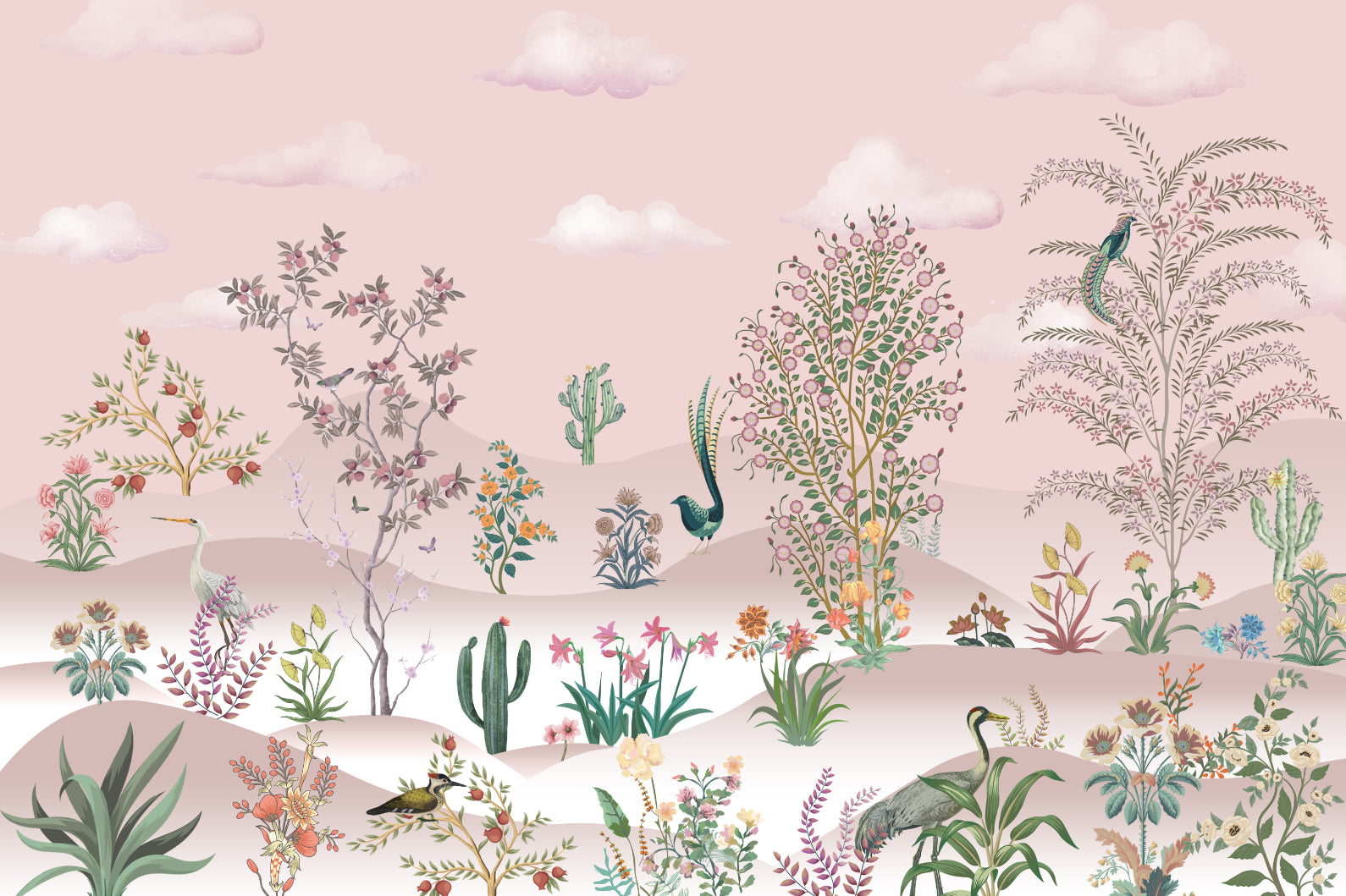 Pink vintage desert botanical wallpaper brings a soft, elegant touch with pastel dunes, delicate florals, and exotic birds. The detailed floral and fauna wallpaper showcases blooming trees, cacti, and graceful peacocks, creating a serene atmosphere. The hand-painted watercolor nature mural blends pink and earthy tones, complementing modern and classic interiors. Perfect for bedrooms, living rooms, and offices, this vintage botanical wallpaper highlights intricate botanical elements. The gentle hues and scenic details offer a timeless appeal. The desert garden scene wallpaper pairs well with neutral or bold accents, enhancing any room's unique natural charm and sophistication.