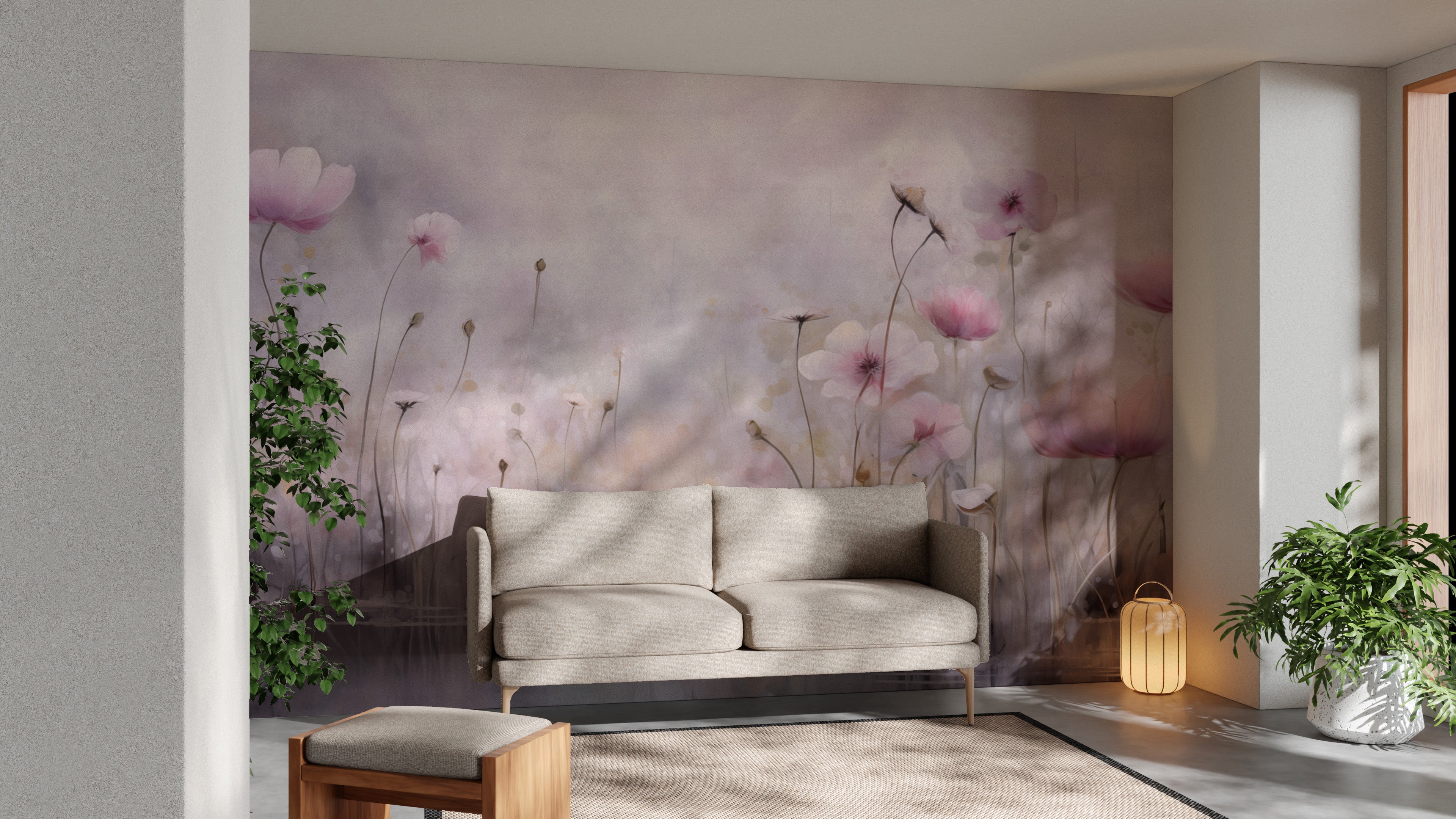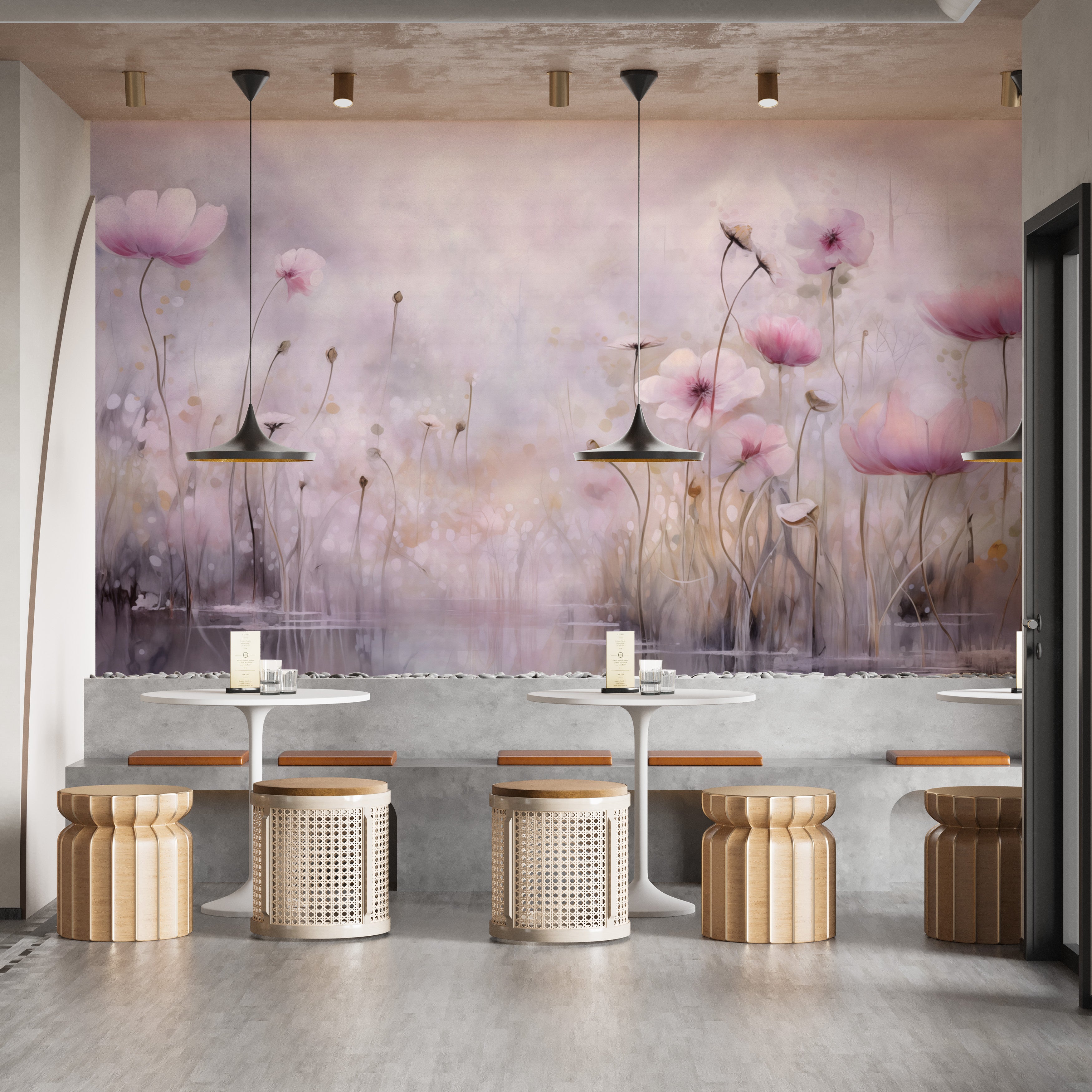 Pink water poppies floral wallpaper for a serene, elegant room.