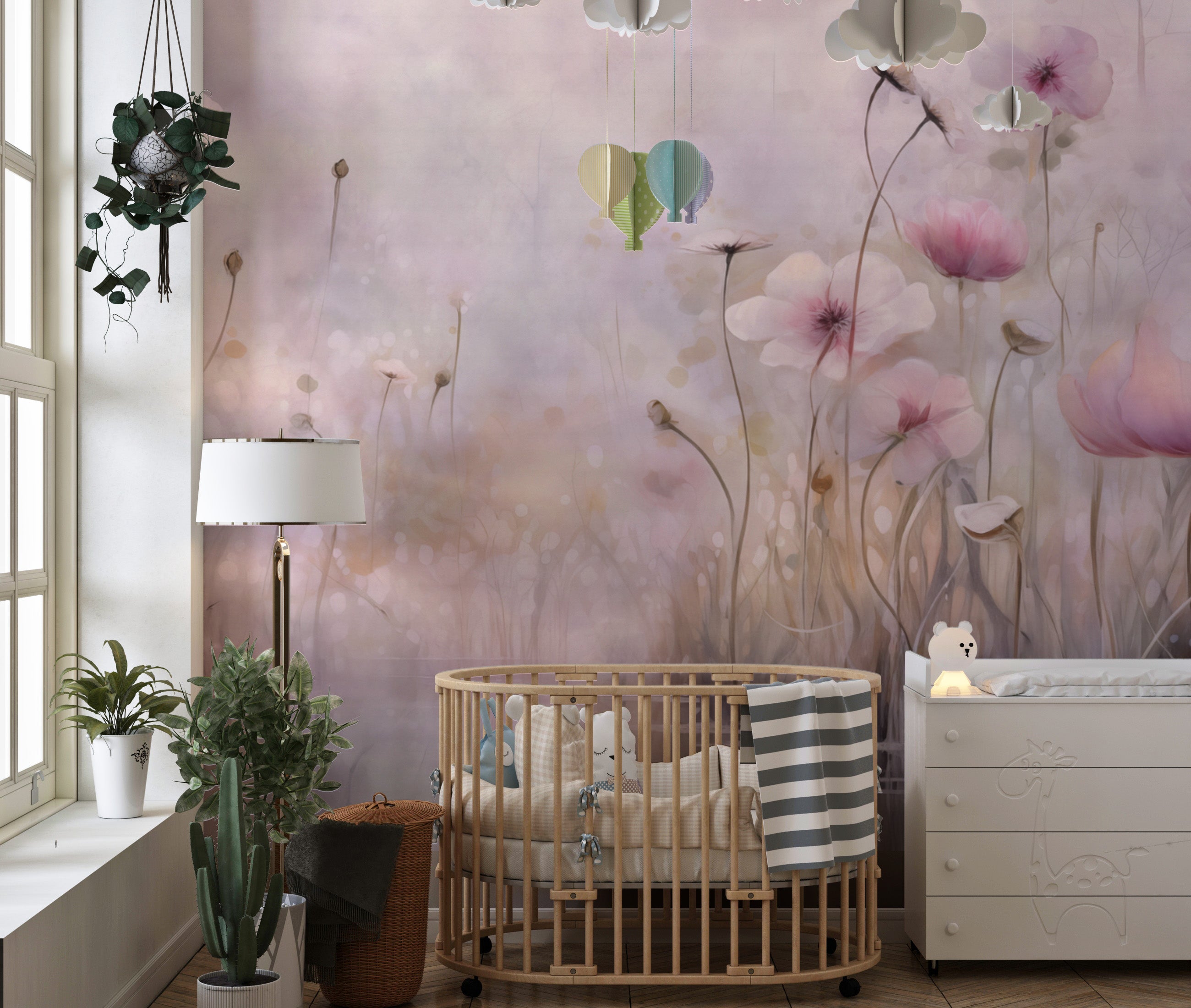 Delicate pink water poppies floral wallpaper for a calming ambiance.