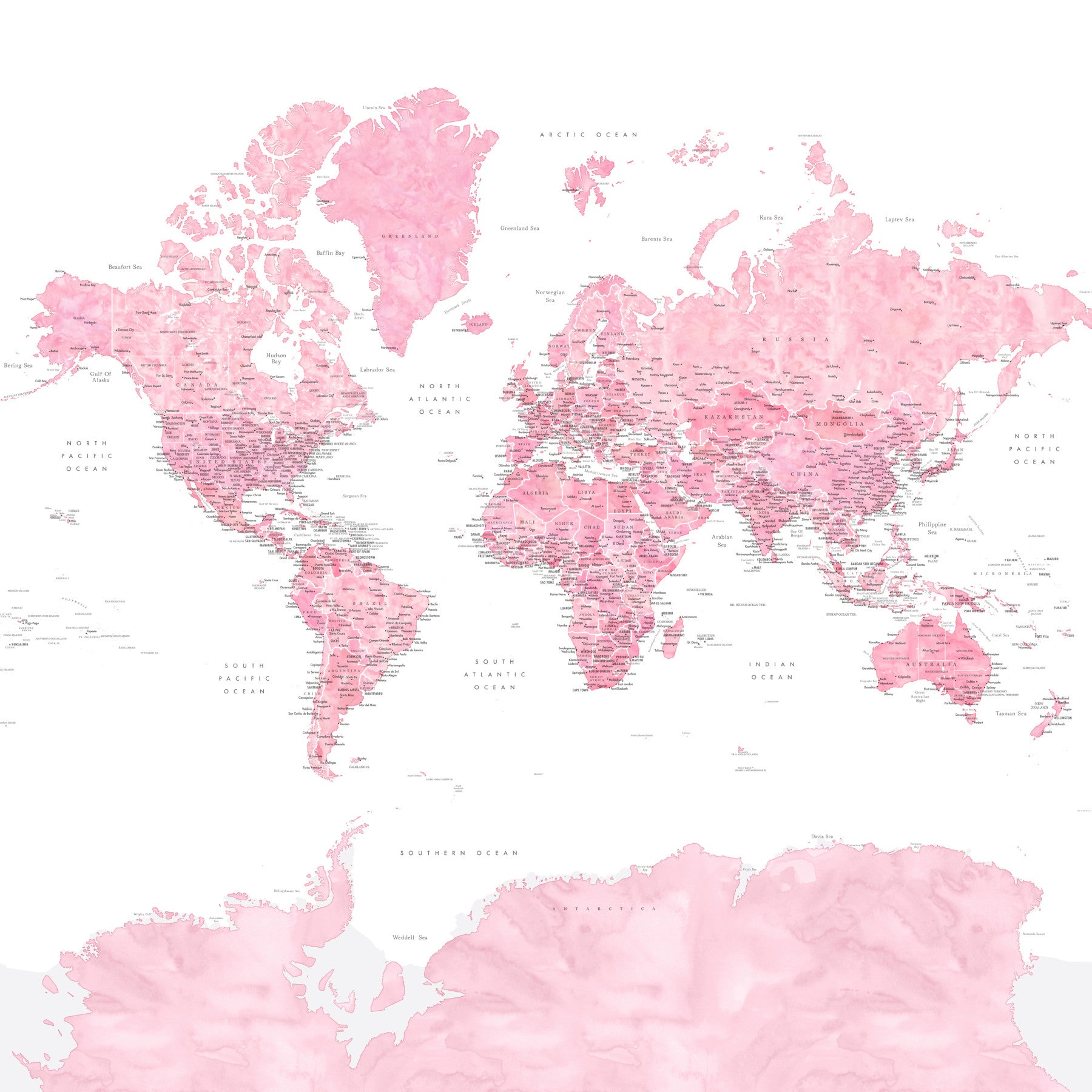 Artistic watercolor-style pink map for kids’ rooms