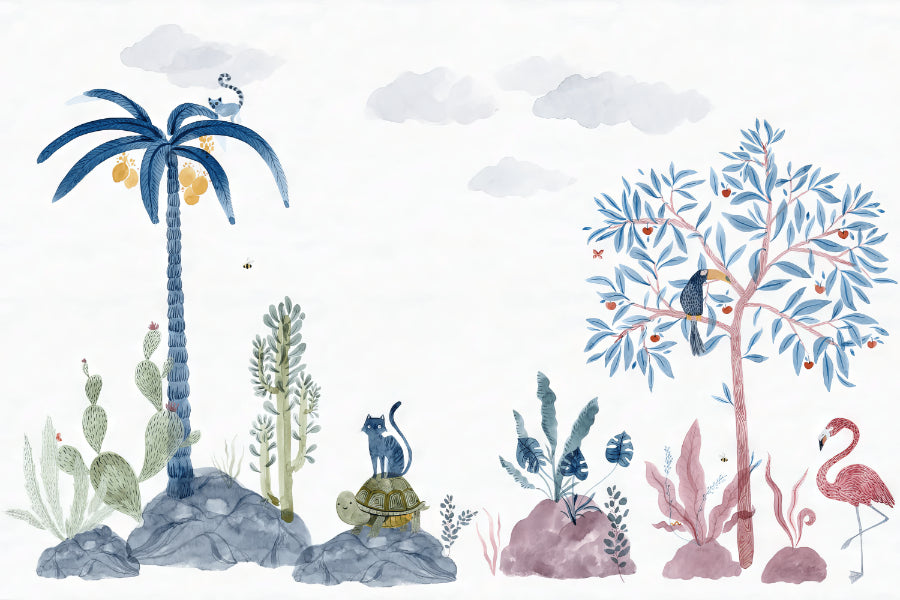 Playful wildlife wallpaper with tropical flora and fauna.
