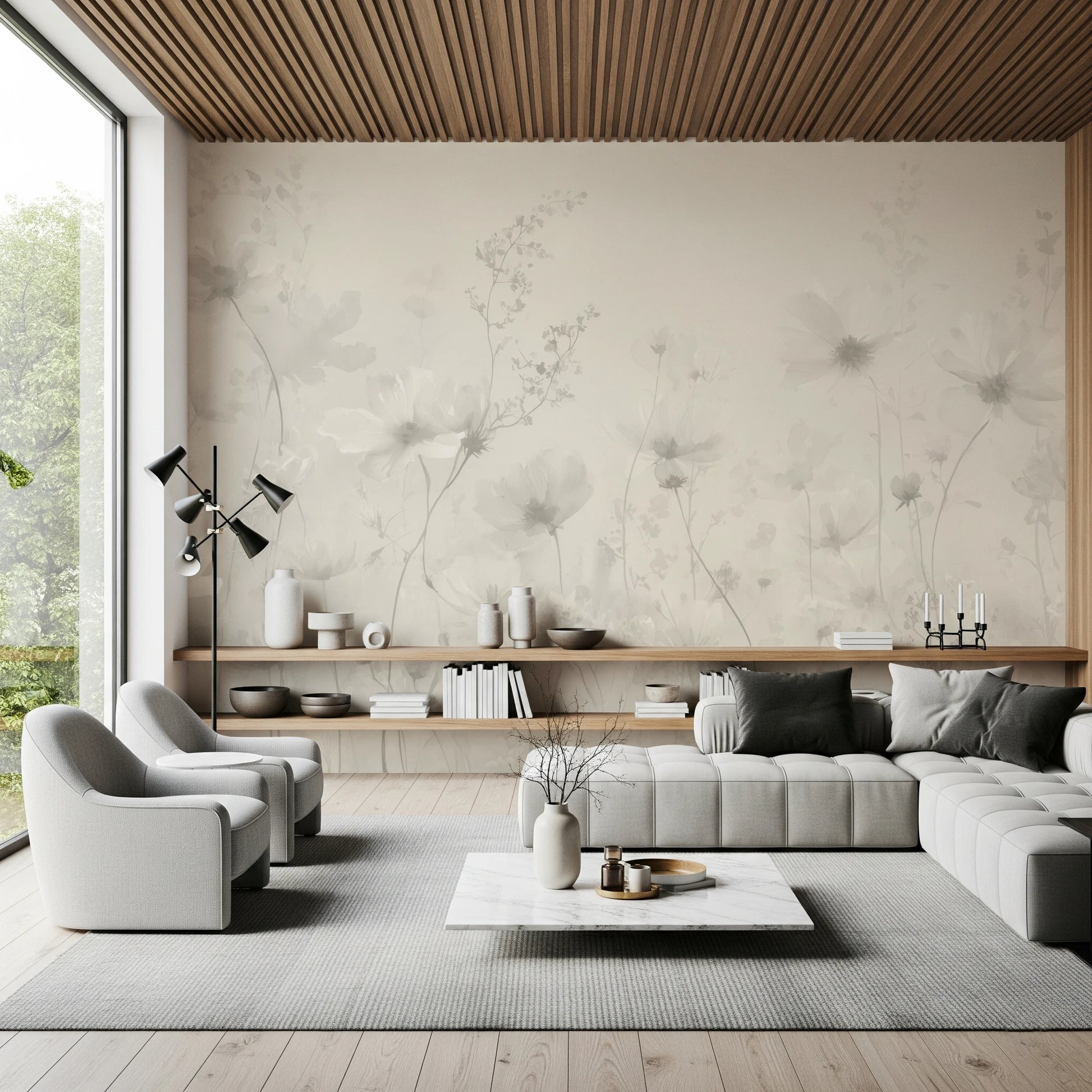 Immerse your space in the gentle embrace of 'Poetic Soft Floral – Linen.' This delicate wall covering captures the ethereal beauty of a wildflower meadow bathed in a soft, diffused light. Subtle floral motifs, rendered in a harmonious palette of warm neutrals, create a calming and sophisticated backdrop. The design evokes the texture and tranquility of natural linen, adding a layer of understated elegance to any room. The artwork whispers of spring meadows and peaceful gardens. It brings the beauty of nature indoors with its understated and timeless charm. Perfect for creating a serene sanctuary in your home. Infuse your living space with serenity and transform any room into a peaceful haven.