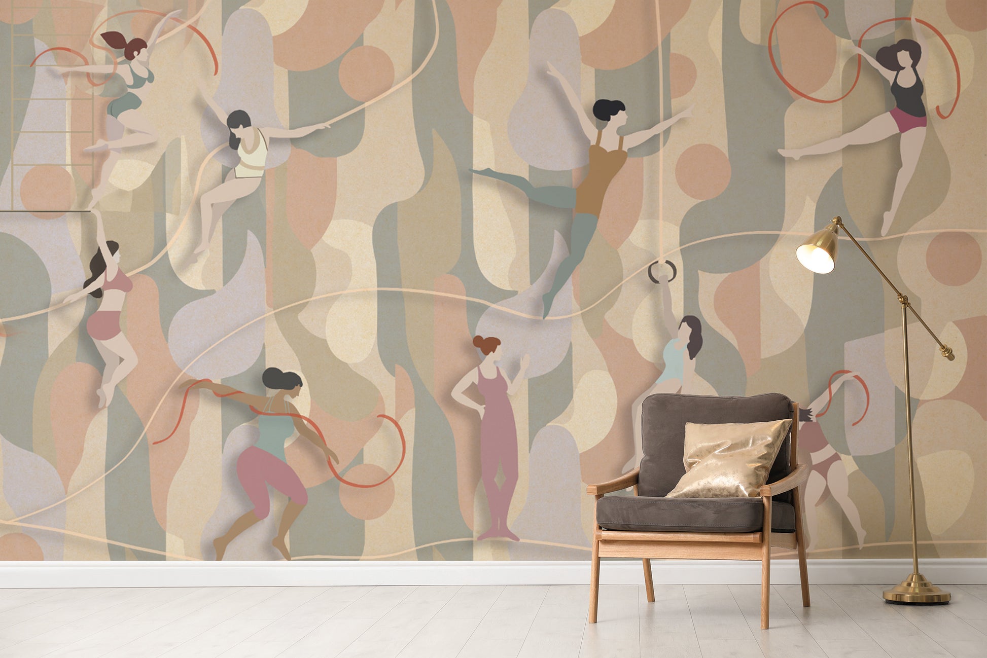 Dance into your life with Poise in Motion Rhythmic Dance Wallpaper. This striking design features fluid motion portrayals of graceful gymnasts and dancers, accentuated by rhythmic ribbons and artistic silhouettes. The soft, earthy tones set a soothing, dynamic tone, making them ideal for dance studios, creative spaces, or modern interiors. Inspired by the beauty of movement and balance, this wallpaper embodies poise in expression. Whether it is for a workout space or a work of art, this design will transform any room with rhythm, passion, and graceful motion.