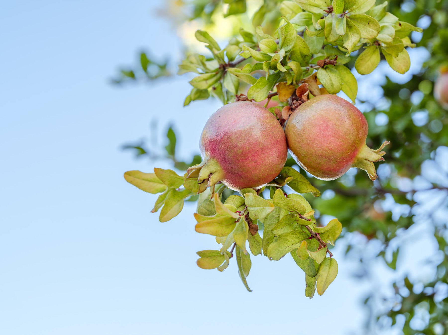 Pomegranate fruits hanging and maturing on tree branch against blye sky. Bring nature inside with this vibrant wallpaper for walls. The image features pomegranates in a variety of hues that add warmth to any room. The composition highlights the natural beauty of the fruit, complemented by lush green leaves against a soft blue sky. It introduces a touch of the outdoors, suitable for a kitchen, dining room, or living space, creating a calm and inviting environment. This design works well with natural wood and neutral color palettes.