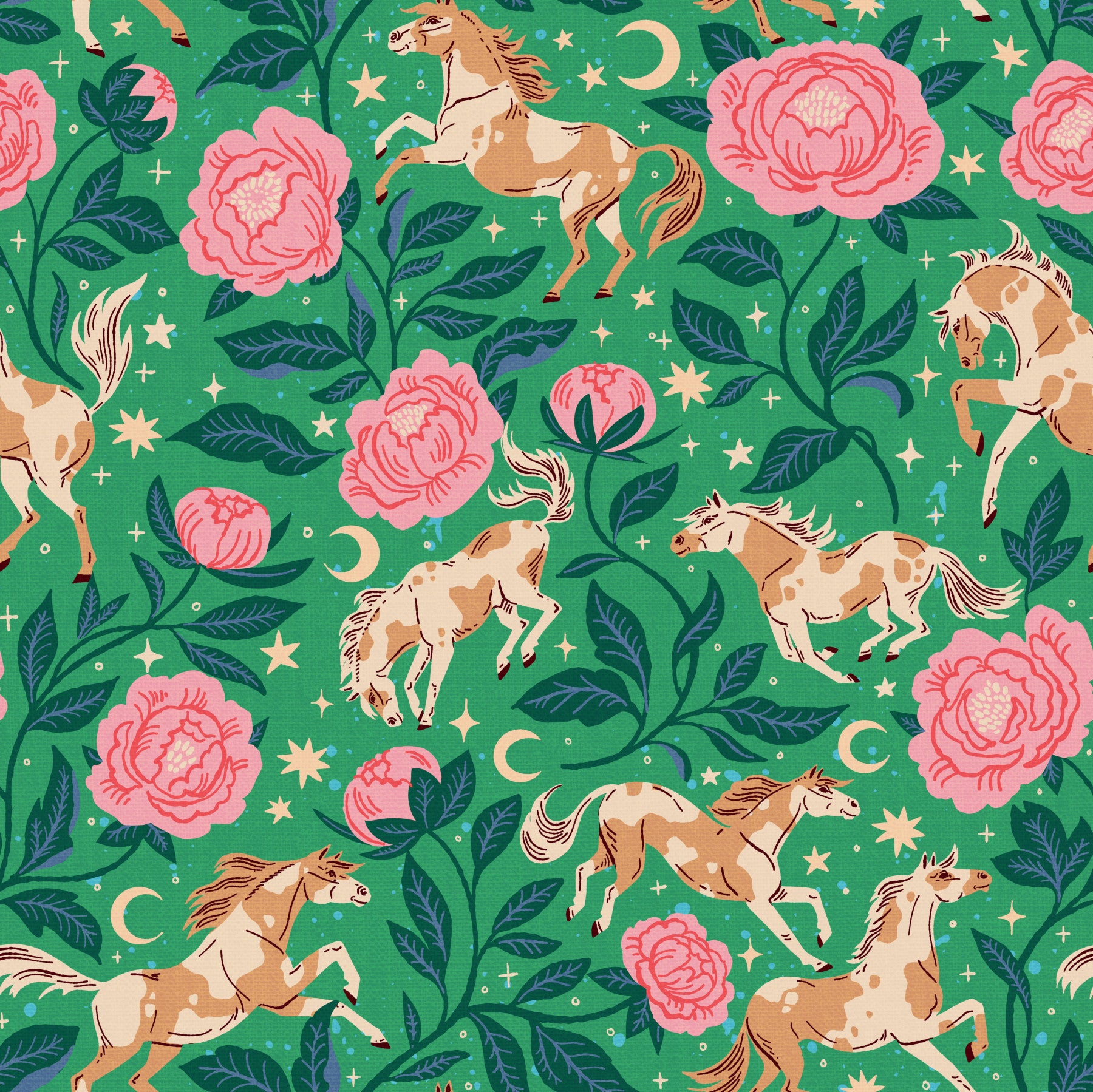 Embrace the enchanting spirit of the Wild West with this vibrant wallpaper. A captivating design featuring spirited paint ponies in full gallop, interspersed with lush, blooming peonies. The rich teal background is punctuated by twinkling stars and crescent moons, creating a whimsical, almost dreamlike atmosphere. This nostalgic Americana-inspired pattern blends the beauty of nature with the untamed energy of the frontier, perfect for adding a touch of romantic ruggedness to any digital device.