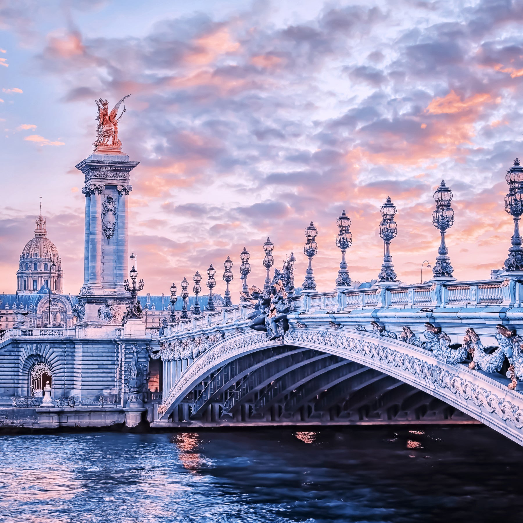 This captivating wallpaper transports you to the heart of Paris, capturing the breathtaking beauty of the Pont Alexandre III at sunset. The bridge's intricate design, adorned with statues and ornate lampposts, is dramatically highlighted against a sky awash in warm pink and soft lavender tones. The tranquil Seine River mirrors the bridge's elegance, creating a mesmerizing reflection. The image evokes feelings of romance, serenity, and wanderlust, perfect for those who dream of Parisian adventures.