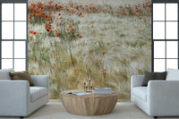 Transform your space with this serene field of poppies. Golden wheat sways gently, dotted with bursts of red poppies. This wallpaper for walls brings the calmness of the countryside to any room. It particularly suits a living room or bedroom, where its soft tones and floral design will add a touch of nature and peace. The design complements interiors, creating a tranquil and inviting space.