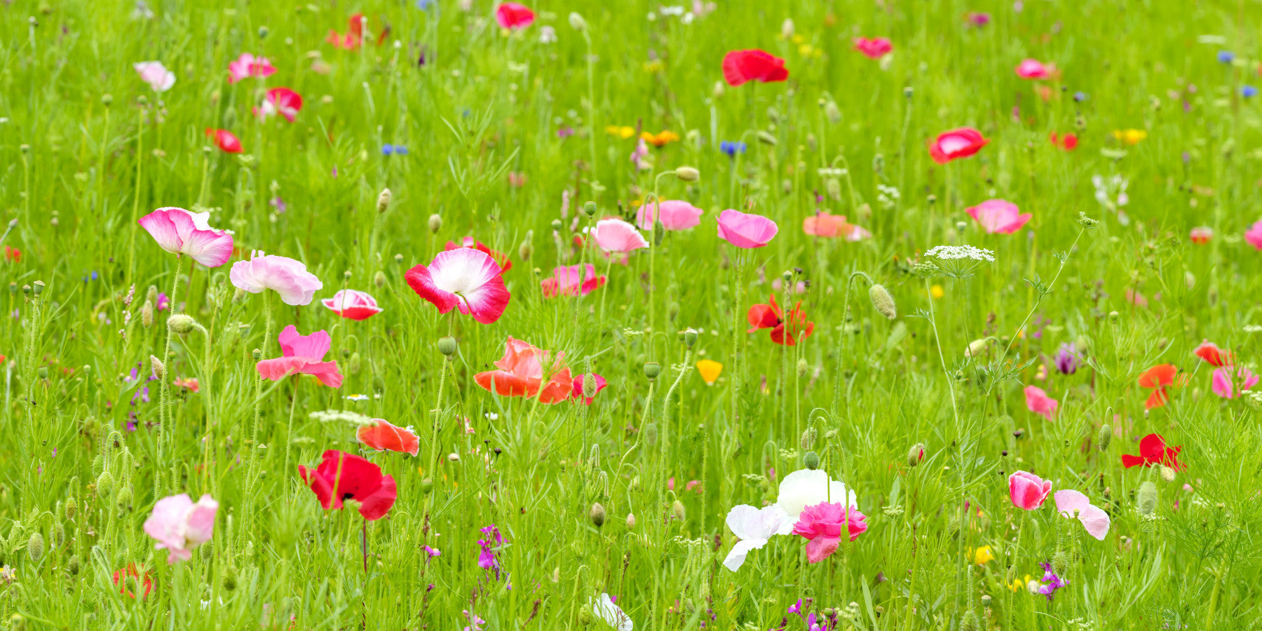 Meadow flowers. Bring the beauty of a wildflower meadow inside with this vibrant wallpaper for walls. A profusion of poppies in shades of pink, red, and white dances among lush green grasses, creating a cheerful, energetic atmosphere. This design works wonderfully in a living room, bedroom, or kitchen. Brighten your space and infuse it with the freshness of a spring day. The vivid hues and natural composition perfectly complement both contemporary and rustic interiors.