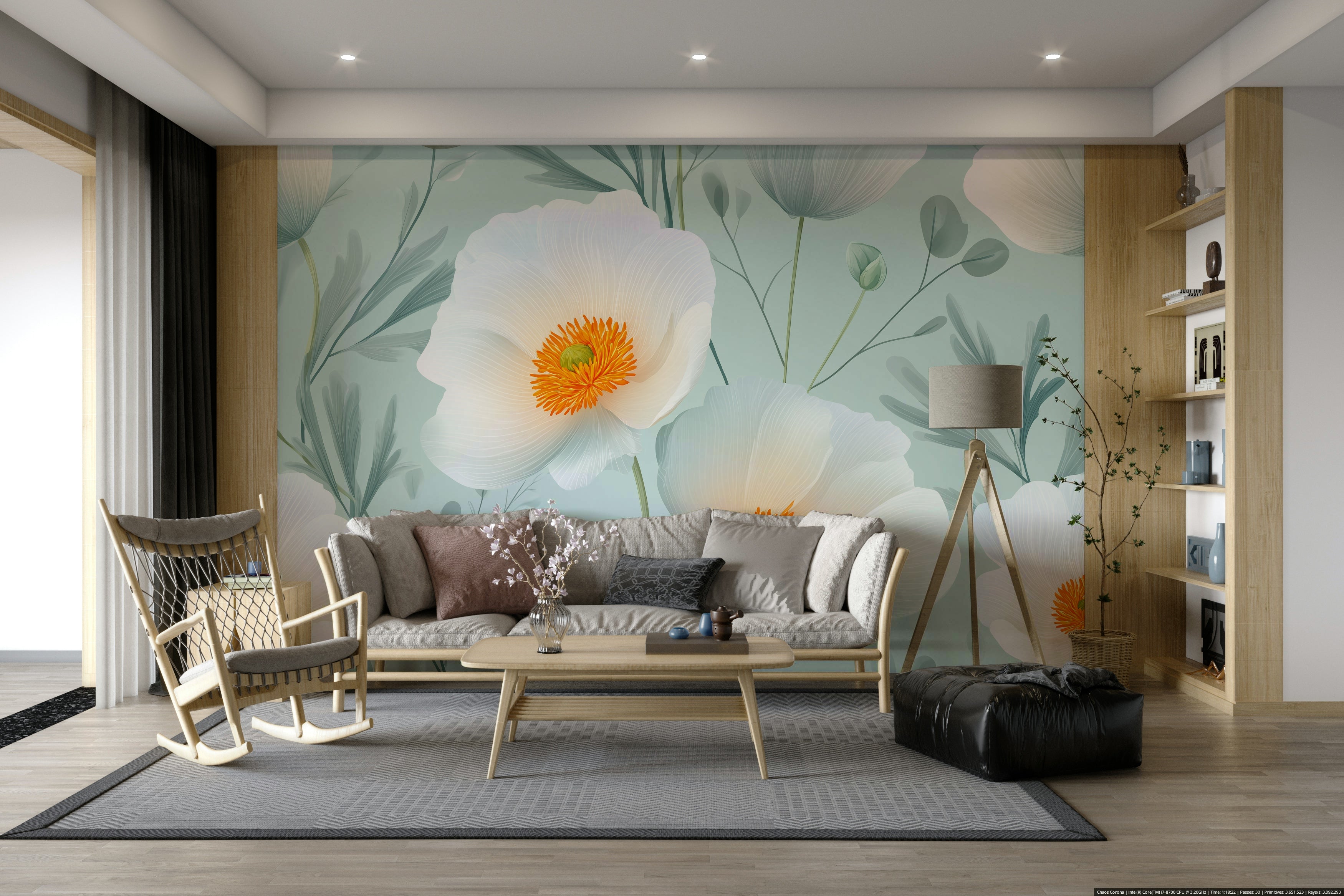 Bring a touch of calm beauty to your home with this tranquil floral wallpaper. Large white poppies with orange centres bloom against a soft teal backdrop, offering a peaceful atmosphere. This design brings a refined and refreshing look to any room. The graceful stems and delicate leaves add depth and dimension. Use this wallpaper for walls in bedrooms, living rooms, or hallways to create a relaxing retreat. It will complement minimalist, Scandinavian, or contemporary interiors.