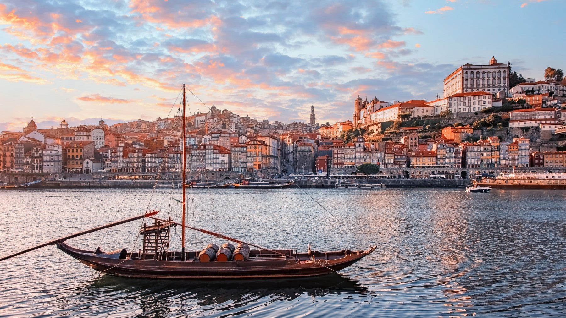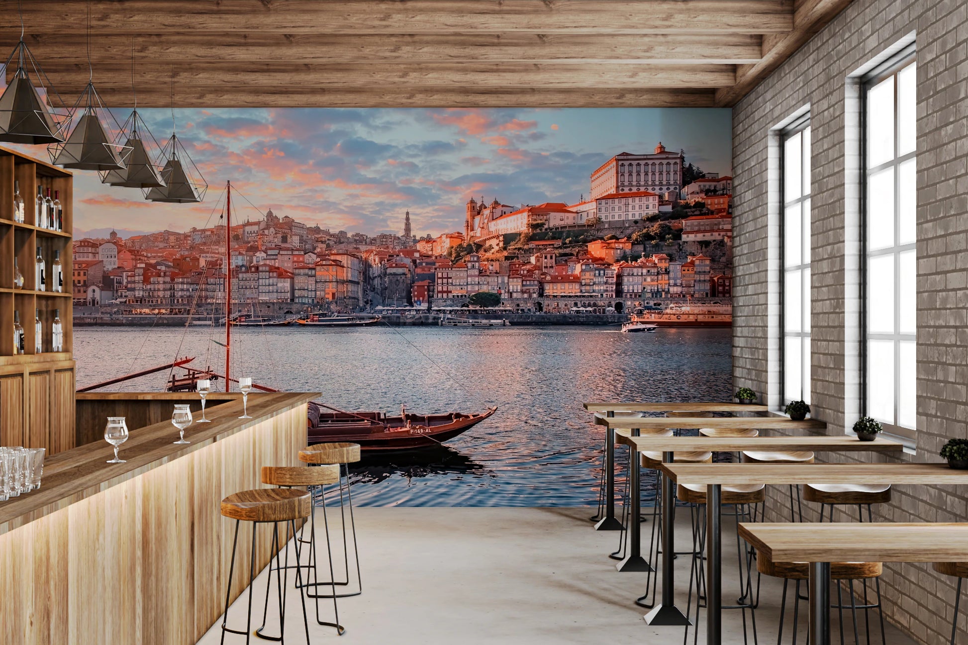 Bring the serene beauty of Porto to your walls with this stunning wallpaper. The soft, dreamy colours of the sunset, reflected on the tranquil water, create a calming ambiance. The image captures the historic charm of the city with its colourful buildings and traditional boats. This wallpaper for walls infuses character and elegance into any space, especially living rooms, dining rooms, or offices. The warm hues of the sunset complement natural wood tones and neutral colour schemes, making it an ideal backdrop for sophisticated interiors. It transforms your space into a captivating vista.