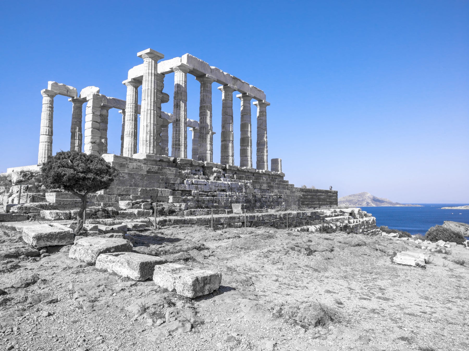 Old pillars of the Temple of Poseidon, Greece. Transform your space with this striking portrayal of ancient temple ruins. The powerful columns and stark monochromatic stone create a dramatic contrast with the vivid blue sky, adding depth and an artistic mood to any space. Consider this wallpaper for walls to enhance your study, office, or living room, injecting a historical mood and inspiring contemplation. Its adaptable design blends well with both modern and rustic decor, bringing unique charm and creating a space that speaks volumes.