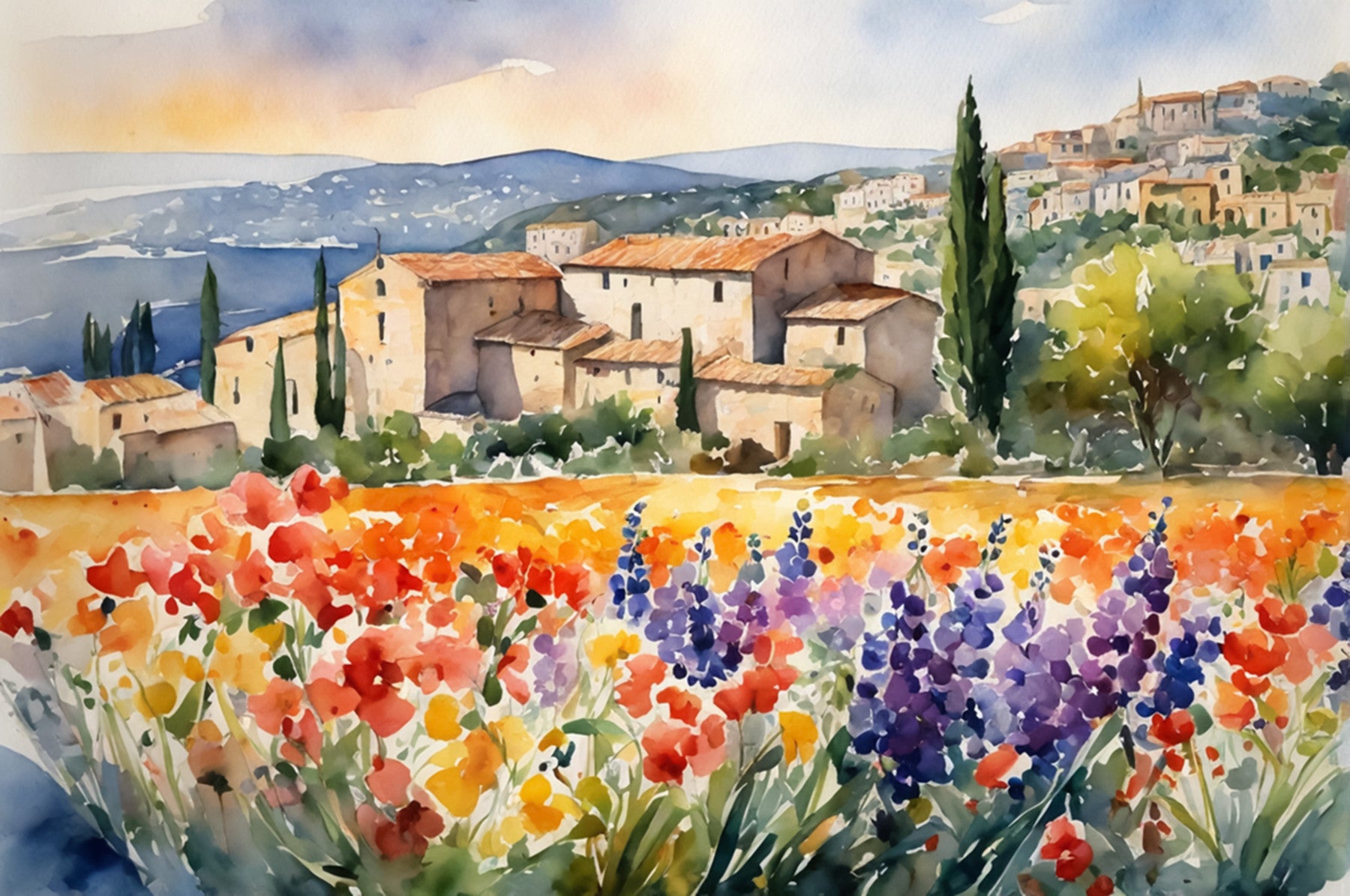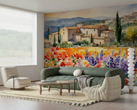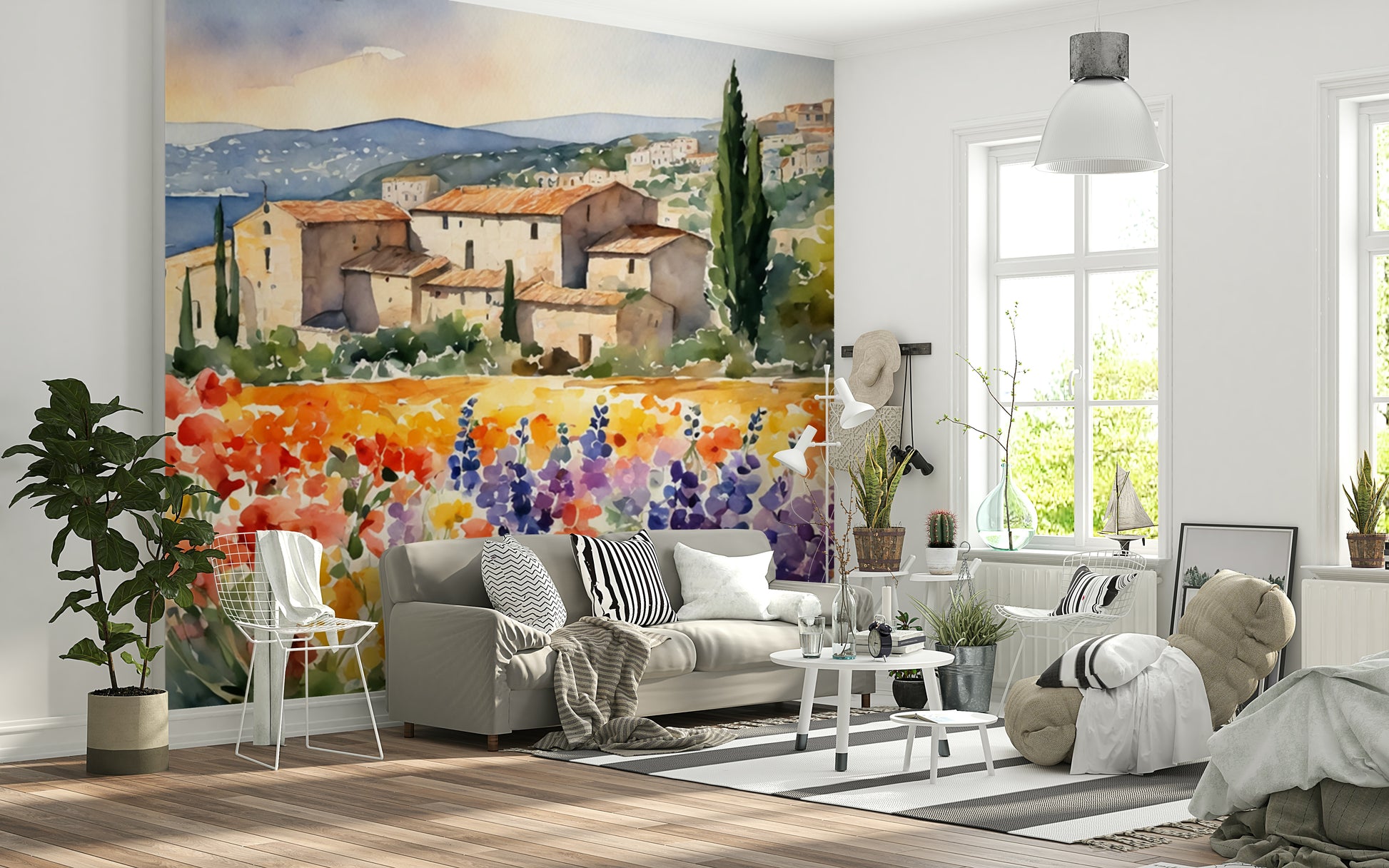 Bring the charm of the French countryside to your home with this watercolour wallpaper for walls. A dreamy watercolour wash captures a sun-drenched village nestled among rolling hills and vibrant fields of flowers. The soft palette of ochre, lavender, and azure creates a soothing, serene atmosphere. This design enhances bedrooms, living rooms, or dining areas. It invites a sense of peaceful escape into any interior. Let this charming landscape transform your space into a tranquil retreat, perfect for creating a relaxing and inviting ambiance.
