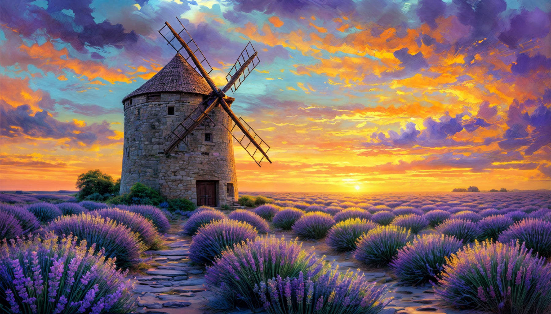 This wallpaper transports you to the idyllic lavender fields of Provence. Witness a vintage windmill against a vibrant sunset, painting the sky with orange and purple tones. The endless lavender fields create a sense of peace and beauty. This wallpaper for walls becomes a unique feature in bedrooms or living rooms. Let the scenic style enhance any home, infusing it with warmth and natural elegance. It perfectly complements interiors with light colours and French-inspired decor.