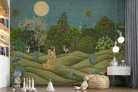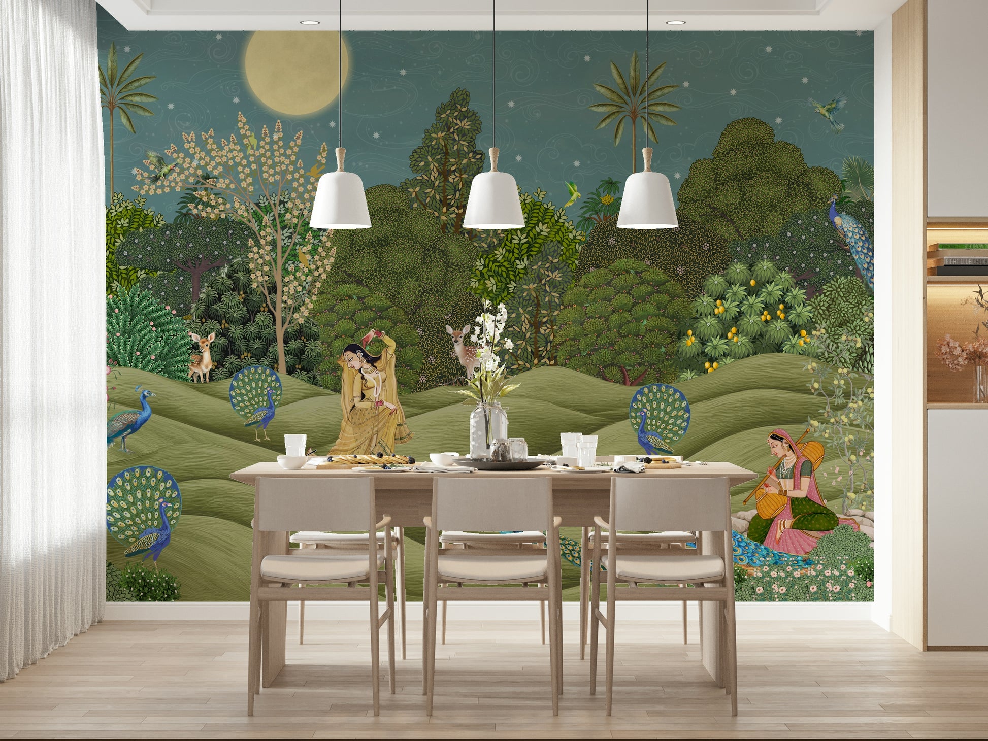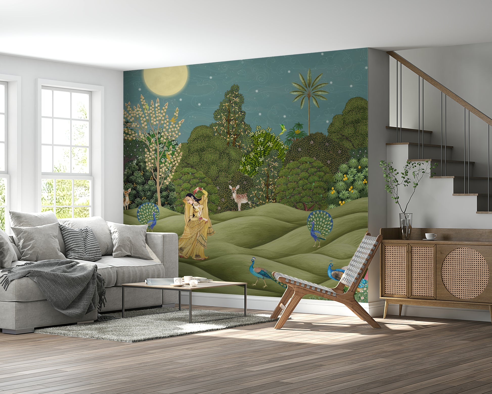 Step into the enchanting world of "Purnima Paradise," a wall décor piece that captures the ethereal beauty of a moonlit night. This scene is inspired by the delicate details of traditional Indian art, presenting a serene landscape under the soft glow of a full moon. Verdant hills are dotted with stately peacocks and graceful deer, creating a peaceful and harmonious tableau. A traditionally dressed maiden dances in the moonlight while another plays her instruments to a nearby peacock. Lush trees and flowering shrubs, carefully detailed, create a thriving habitat. This piece provides a sense of calm and invites you to lose yourself in the quiet grandeur of a paradise illuminated by the radiant Purnima. Transform any space into a tranquil retreat with this artwork, where nature and art intertwine.
