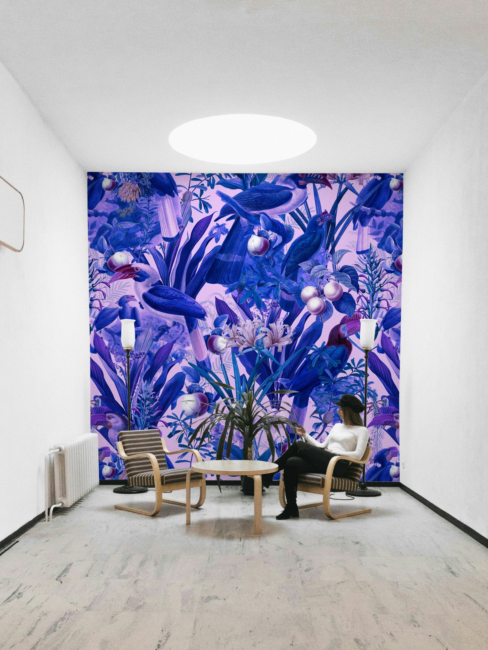 Immerse yourself in the mystical 'Purple Jungle,' a vibrant wallpaper design where exotic hornbills perch amongst lush, deep purple foliage. Intricate botanical details, including striking lilies and glistening fruits, add depth and texture to this captivating scene. The monochromatic color palette creates a dreamlike atmosphere, perfect for adding a touch of surreal elegance to any digital device. This wallpaper evokes a sense of tranquility and mystery, transporting you to a hidden world of vibrant flora and fauna rendered in a rich, enchanting purple hue. The seamless pattern ensures a captivating visual experience, no matter the screen size.
