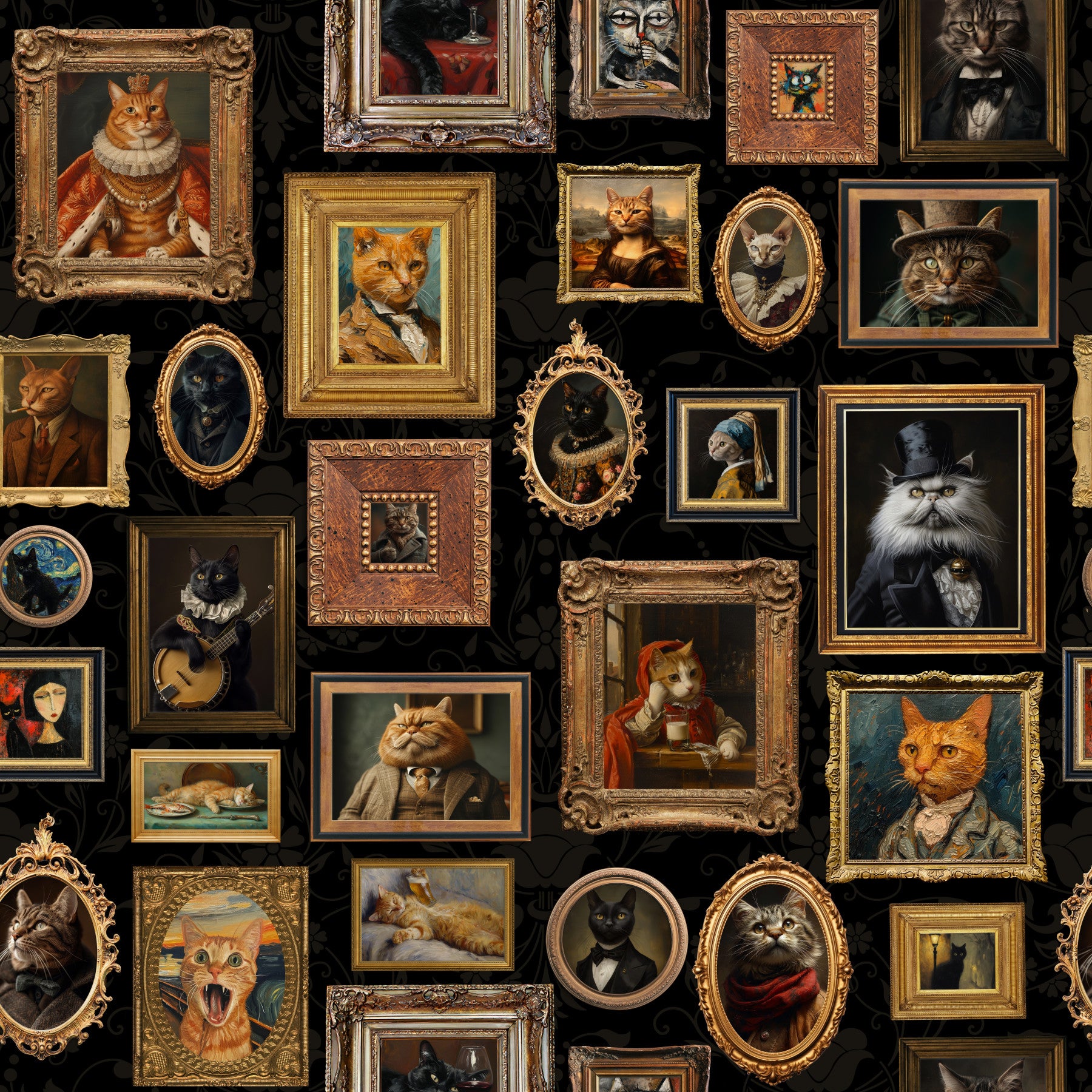 Adorn your space with this whimsical collection of cat portraits! These feline masterpieces, displayed in ornate gold frames against a dark, patterned backdrop, bring a touch of humor and class. From a regal ginger cat to famous artworks re-imagined with cats, each piece captures the spirit of fine art. This wallpaper for walls transforms any room into a unique gallery. Suitable for living rooms, studies, or any space where you want to showcase a playful yet refined style.